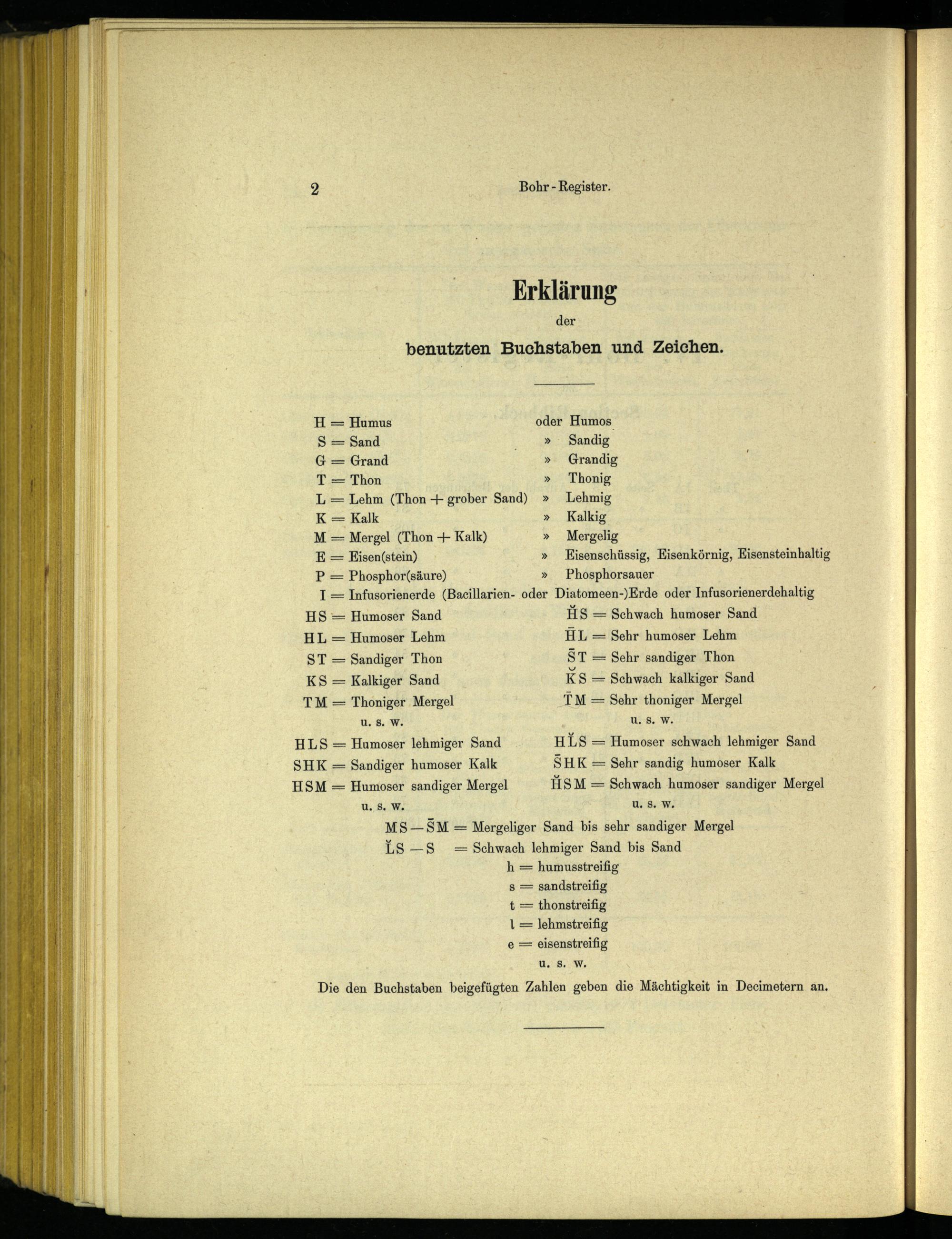 MS — SM = Mergeliger Sand bis sehr sandiger Mergel LS —S = Schwach lehmiger Sand bis Sand h = humusstreifig s = sandstreifig t = thonstreifig l = lehmstreifig e = eisenstreifig u. s. w.