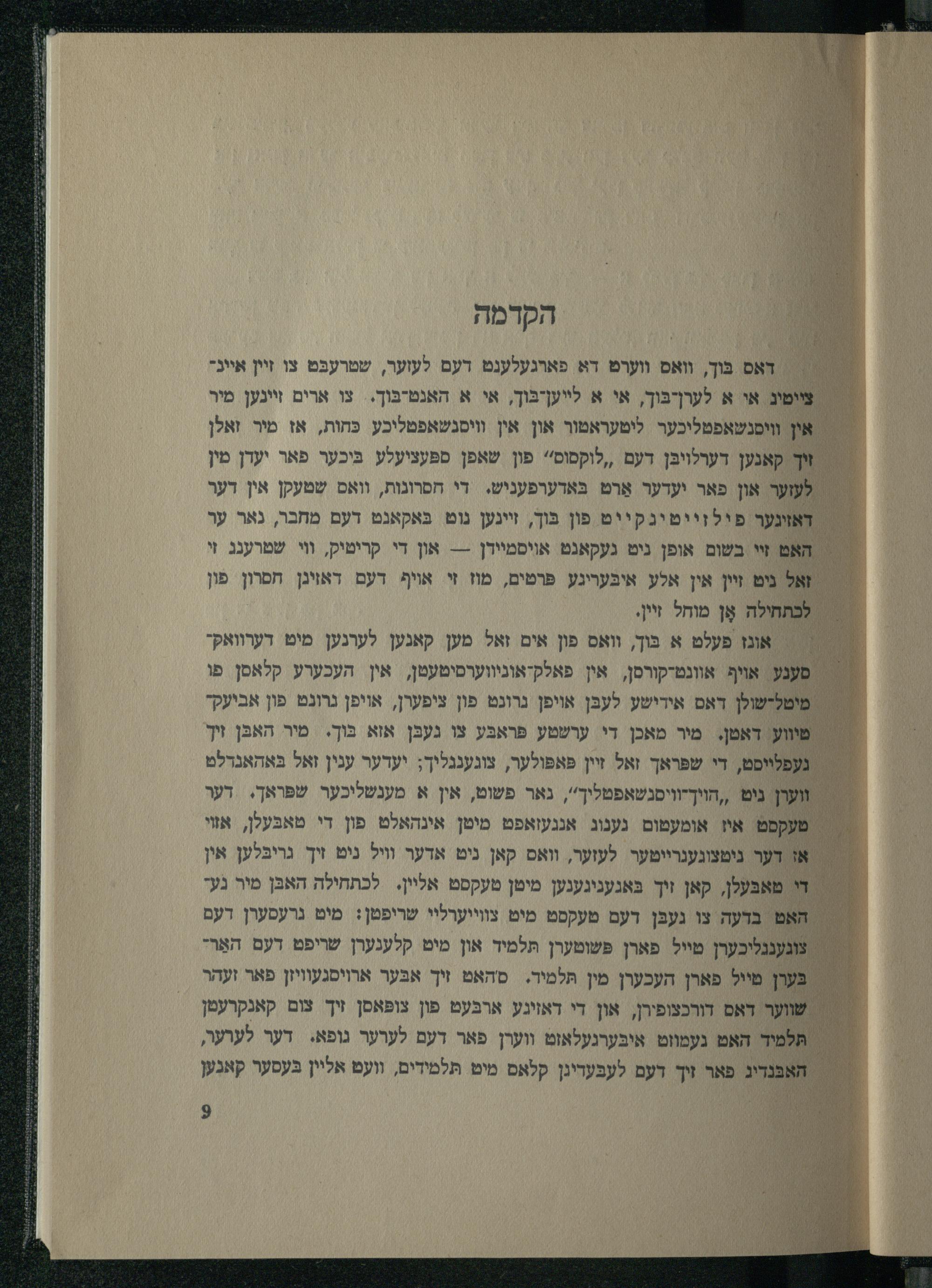 דאס בּוך, וואס ווערט דא פארגעלענט דעם לעזער, שטרעכּט צו זיין איינציימיג אי א לערן-בּוך, אי א לײעןבּוך, אי א האנט-בּוך.. צו ארים זיינען מיר אין וויסנשאפטליכער ליטעראטור און אין וויסנשאפטליכע כּחות, אז מיר זאלן זיך קאנען דערלויבּן דעם ,,לוקסוסי' פון שאפן ספּעציעלע בּיכער פאר יעדן מין לעזער און פאר יעדער אַרט בּאדערפעניש. די חסרונות, וואס שטעקן אין דער דאזינער פילוייטינקייט פון בּוך, זיינען נוט בּאקאנט דעם מחבר, נאר ער האט זיי בשום אופן ניט געקאנט אויסמיידן--- און די קריטיק, וי שטרענג זי זאל ניט זיין אין אלע איבּעריגע פּרטים, מוז זי אויף דעם דאוינן חפרון פון לכתחילה אָן מוחל זיין,