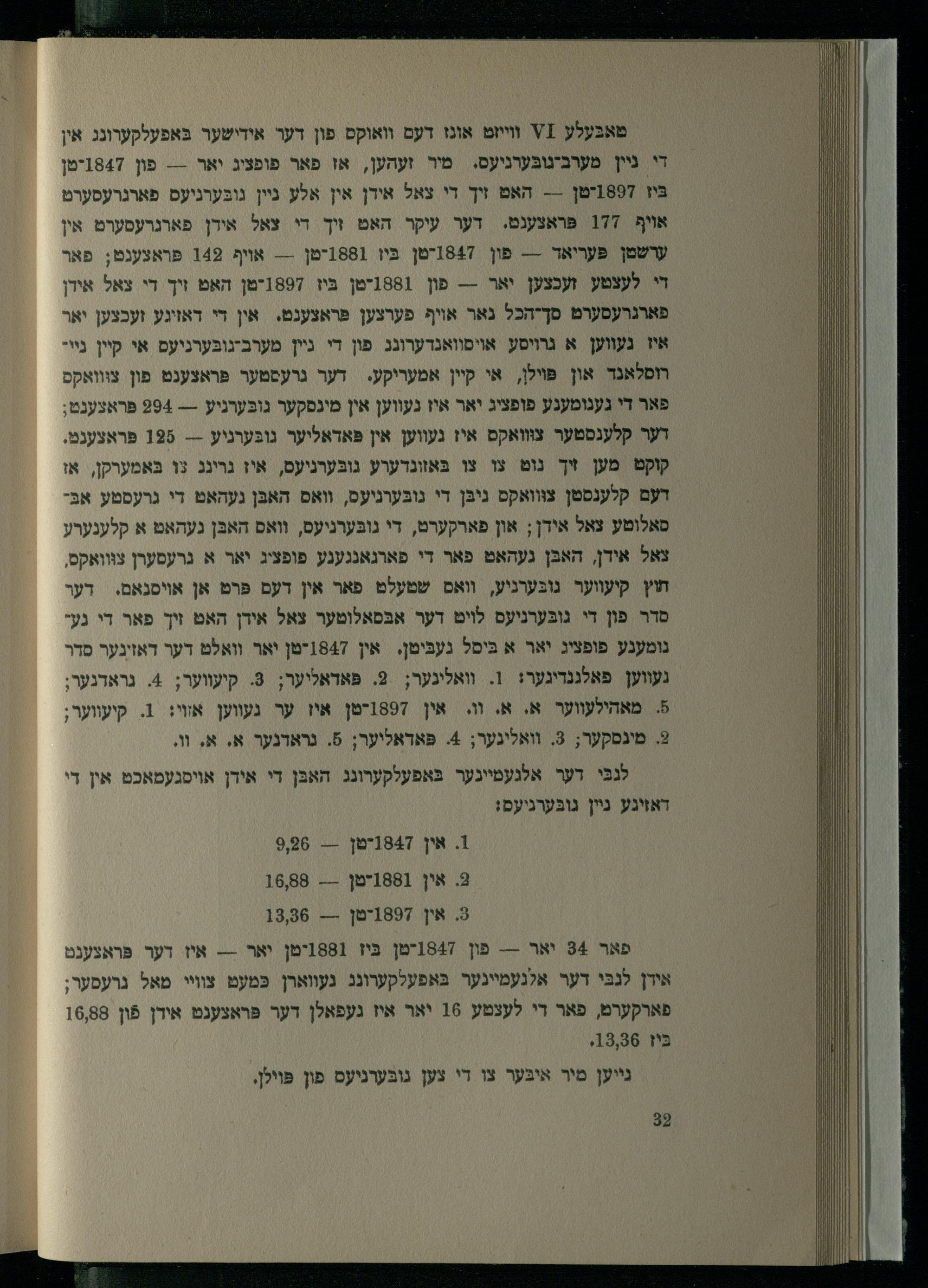 לנבּי דער אלגעטיינער בּאפעלקערונג האבּן די אידן אויסגעמאכט אין די דאזיגע ניין נובּערגיעס; 1 אין 1847ימן--- 9,96 3 אין 1881ימן--- 16,88 9 אין 1897יטן--- 13,86 פאר 34 יאר--- פון 1847-טן בּיז 1881יטן יאר-- איז דער פּראצענט אידן לנבּי דער אלנעמיינער בּאפעלקערונג געווארן כּמעט צוויי מאל גרעסער; פארקערם, פאר די לעצטע 16 יאר איז געפאלן דער פּראצענט אידן פֿון 16,88 בּיז 18,36, נייען מיר איבּער צו די צען גובּערגיעס פון פּױלן,