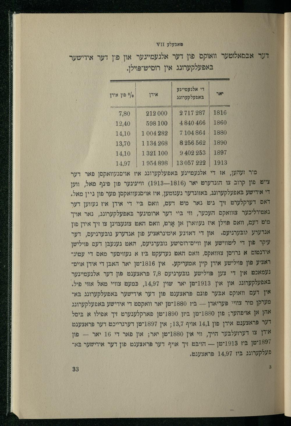 3| 18087222| 1984898| 1497 מור זעהען, אז די אלגעמיינע בּאפעלקערונג איז אויסנעוואקסן פאר דער ציט פון קרוב צו הונדערט יאר(1816---1913) ווייניגער פון פינף מאל, ווען די אידישע בּאפעלקערונג, בּאזונדער גענומען, איז אויסגעוואקסן מער פון ניין מאל. דאם דערקלערט זיך גים נאר מיט דעם, וואס בּיי די אידן איז געווען דעך נאטירליכער צווואקם העכער, וי בּיי דער ארומינער בּאפעלקערונג, גאר אויך מים דעם, וואס פּױלן איז געווארן אן אָרט, וואס האט צונעצויגן צו זיך אידן פון אנדערע גובּערניעס.= און די דאויגע אימינראציע פון אנדערע גובּערניעס, דער : קר פון די ליטווישע און ווייס-רוסישע גובּערניעס, האט געגעבּן דעם פּױלישן אידנטום א גרויסן צווואקס, וואס האט געדעקט כּיז א געוויסער מאס די עמינראציע פון פּוילישע אירן קיין אמעריקע. אין 1816-טן יאר האבּן די אידן אויםגעמאכט אין די צען פּוילישע גובּערניעס 7,8 פּראצענט פון דער אלנעמיינער : באפעלקערונג און אין 1913-טן יאר שוין 1497, כּמעט צוויי מאל אווי פיל. : אץ דעם וואוקס אבּער פונם פּראצענט פון דער אידישער בּאפעלקערונג בּא: מערקן מיר צוויי פּעריאדן-- בּיז 1880-טן יאר וואקסט די אירישע בּאפעלקערונג , אהן אן אױיפּהער; פון 1880-טן בּיזן 1890-טן פארקלענערט זיך אפילו א בּיםל : דער פראצענט אידן פון 14,1 אויף 13,7; אין 1897-טן דערגרייכט דער פּראצענט ײ אודן צו דערועלבּער הייך, װי אין 1880-טן יאר; און פאר די 16 יאר-- פון ז189יטן בִּיו 1918יטן-- הויבּט זיך אויף דער פּראצענט פון דער אידישער בֹּא