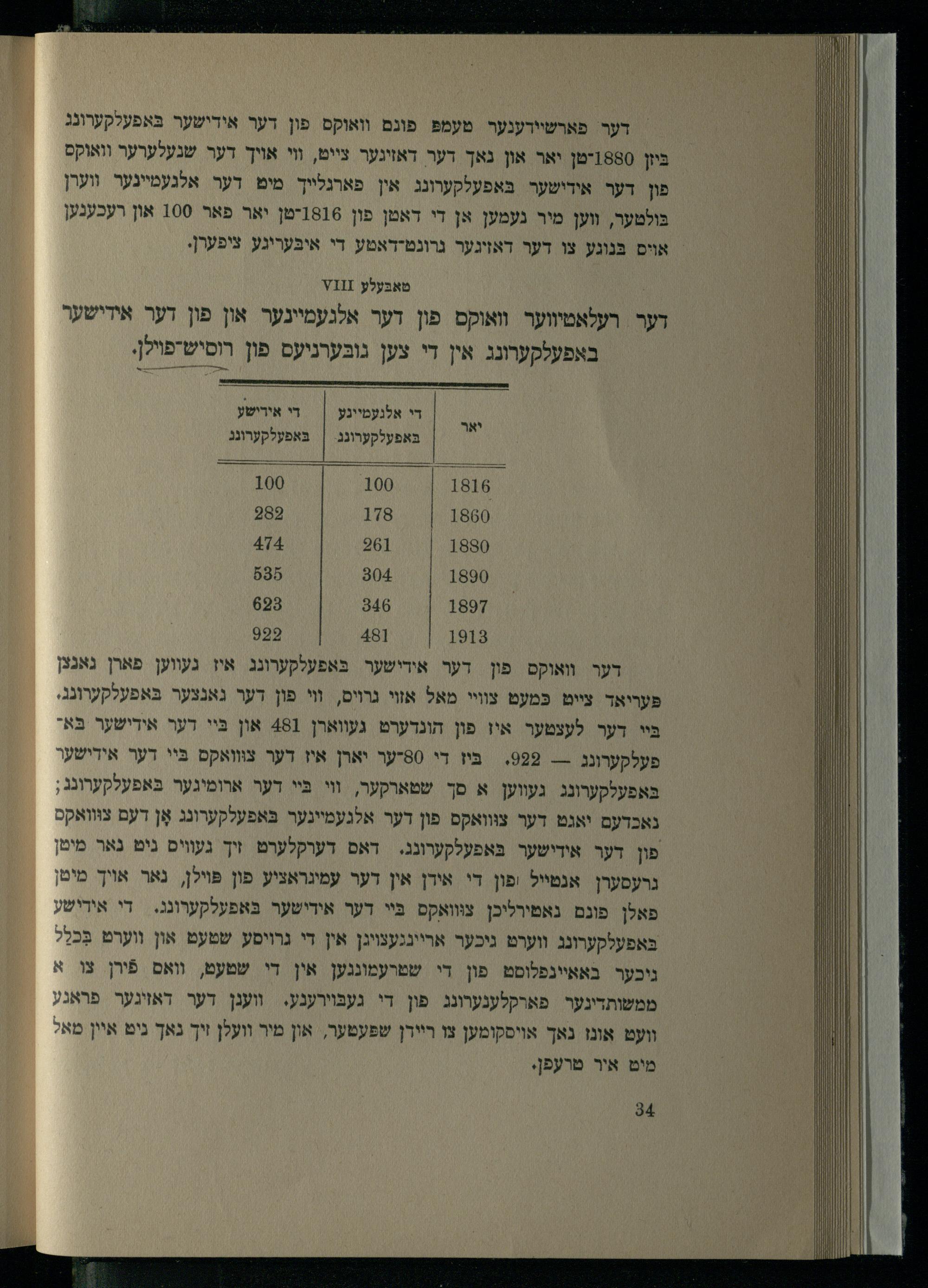 דער וואוקס פון דער אידישער בּאפעלקערונג איז געווען פארן גאנצן פעריאד צייט כּמעט צוויי מאל אזוי גרויס, וי פון דער גאנצער בּאפעלקערונג, בּײ דער לעצטער איז פון הונדערט געווארן 481 און בּיי דער אידישער בּא? פעלקערונג-- 999.= בּיז די 60יער יארן איז דער צווואקס בַּיי דער אידישער באפעלקערונג געווען א סך שטארקער, וי בּיי דער ארומיגער בּאפעלקערונג; נאכדעם יאגט דער צווואקס פון דער אלגעמיינער בּאפעלקערונג אָן דעם צווואקס פון דער אידישער באפעלקערונג.= דאם דערקלערט זיך געוויס נים גאר מיטן גרעסערן אנמייל /פון די אידן אין דער עמיגראציע פון פּױלן, נאר אויך מיטן פאלן פונם נאטירליכן צווואקס בַּיי דער אידישער בּאפעלקערונג.= די אידישע בּאפעלקערונג ווערט גיכער ארייגגעצויגן אין די נרויסע שטעט און ווערט בִּכלֵל גיכער באאיינפלוסט פון די שטרעמונגען אין די שטעט, וואס פֿירן צו א ממשותדינער פארקלענערונג פון די געבוירענע. ווענן דער דאויגער פראנע װועט אונז נאך אויסקומען צו ריירן שפּעטער, און מיר וועלן זיך נאך גיט איין מא? מיט איר טרעפן.