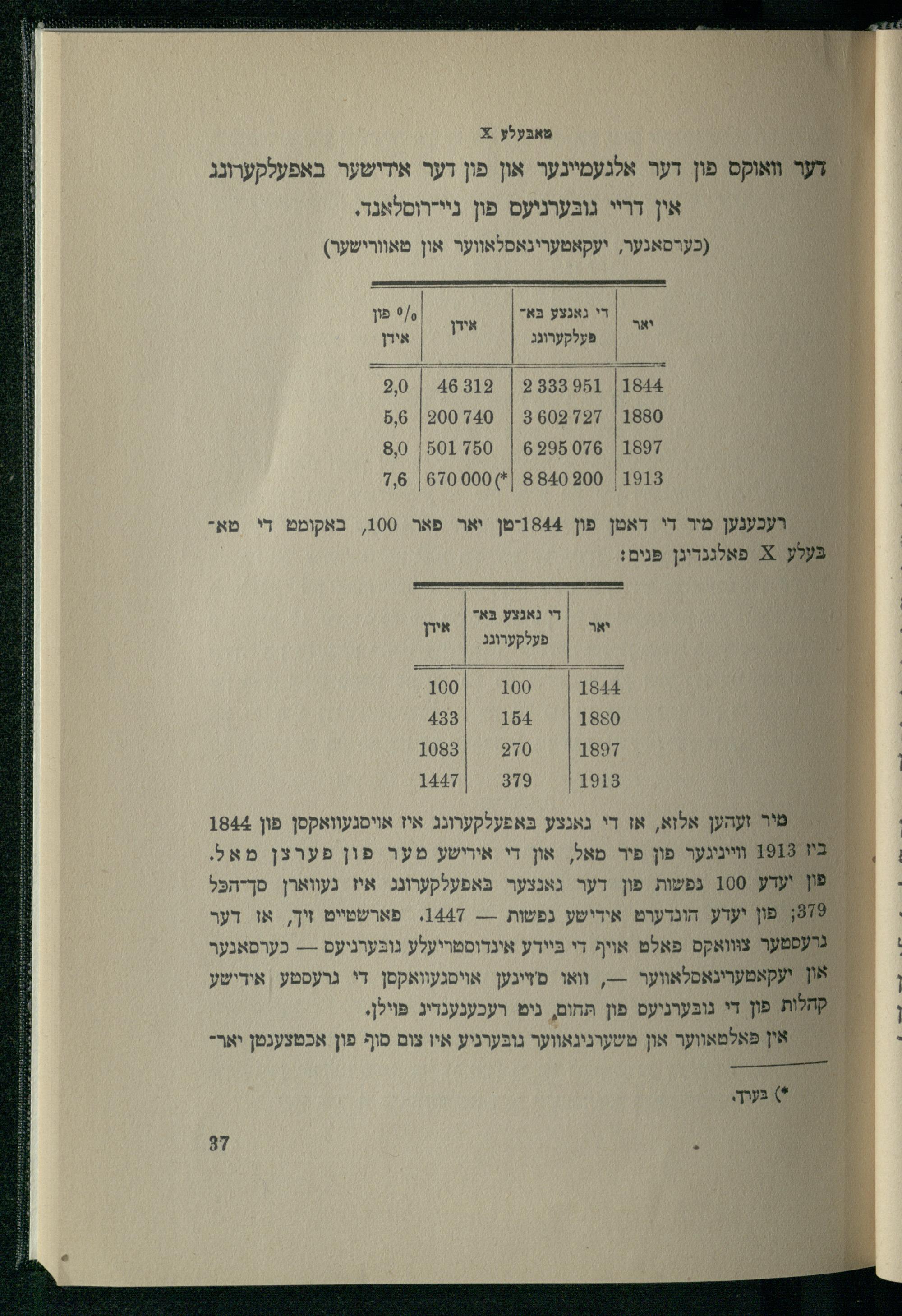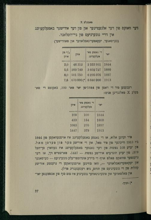 פון יעדע 100 נפשות פון דער גאנצער בּאפעלקערונג איז געווארן סך-הכּל ר /9:9; פון יעדע הונדערט אידישע גפשות-- 1447. פארשטייט זיך, או דער = גרעסטער צווואקם פאלט אויף די בּיידע אינדוסטריעלע גובּערניעס--- כערסאנער י און יעקאטערינאסלאווער---, וואו פזיינען אויסגעוואקסן די אידישע