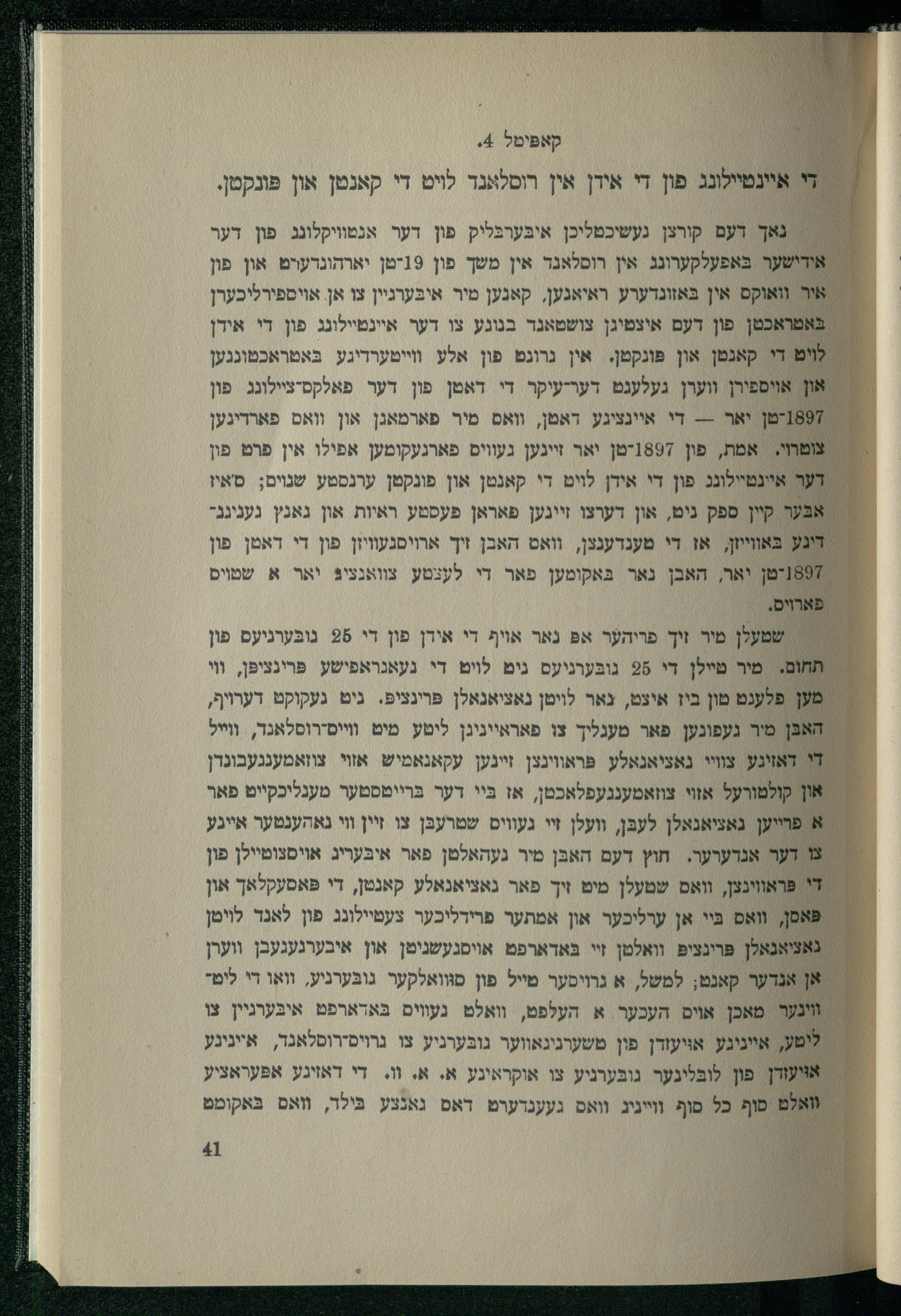נאך דעם קורצן נעשיכטליכן איבּערבּליק פון דער אנטוויקלונג פון דער אודישער באפעלקערונג אין רוסלאנר אין משך פון 19-טן יארהונדערט און פון ײ אור וואוקס אין בּאזונדערע ראיאנען, קאנען מיר איבּערניין צו אן אויספירליכערן באטראכטן פון דעם איצטיגן צושטאנד בנוגע צו דער איינטיילונג פון די אידן }- לױם די קאנטן און פּונקטן. אין נרוגט פון אלע ווייטערדיגע בּאטראכטונגען ' און אויספירן ווערן געלעגט דער-עיקר די דאטן פון דער פאלקסיציילונג. פון 97טן יאר-- די איינציגע דאטן, וואס מיר פארמאגן און וואס פארדינען צומהױ. אמת, פון 1897-טן יאר זיינען געווים פארגעקומען אפילו אין פרט פון דער איינטיילונג פון די אידן לוט די קאנטן און פונקטן ערנסטע שנוים; סאיז אבּער קיין ספק ניט, און דערצו זיינען פאראן פעסטע ראיות און גאנץ געניגנדיגע בּאווייון, אז די מענדענצן, וואט האבן זיך ארויסגעוויזן פון די דאטן פון 1897יטן יאר, האבן נאר בּאקומען פאר די לעצטע צוואנציבּ יאר א שטױיס }|| פֿארױם. || שטעלן מיר זיך פריהער אפּ נאר אויף די אידן פון די 28 נובּערגיעס פון : תחוֹם. מיר טײלן די 28 נובּערניעם גים לוט די געאנראפישע פּרינציפּן, וי מען פלעגט מון ביז איצט, נאר לויטן נאציאנאלן פּרינציפּ. ניט געקוקט דערויף, האבּן מיר געפונען פאר מעגליך צו פאראייניגן ליטע מיט ווייס-רוסלאנד, ווייל די דאזיגע צוויי נאציאנאלע פּראווינצן זיינען עקאנאמיש אזוי צוזאמענגעבונרן און קולמורעל אזוי צוזאמענגעפלאכטן, אז בּיי דער בּרייטסטער מענליכקייט פאר א פרייען נאציאנאלן לעבּן, וועלן זי געווים שטרעבּן צו זיין וי נאהענטער אייגע צו דער אנדערער. חוץ דעם האבּן מיר געהאלטן פאר אובּעריג אויסצוטיילן פון די פּראווינצן, וואס שטעלן מיט זיך פאר נאציאנאלע קאנטן, די פּאסעקלאך און פּאסן, וואס בּיי אן ערליכער און אמתער פרידליכער צעטיילונג פון לאנד לויטן גאציאנאלן פּרינציפּ וואלטן זי בּאדארפט אויסגעשניטן און איבערגעגעבן ווערן אן אנדער קאנט, למשל, א גרויסער מייל פון סווואלקער גובּערניע, וואו די ליטוויגער מאכן אוים העכער א העלפט, וואלט געווים באדארפט איבּערניין צו ליטע, אייניגץ אויעודן פון טשערניגאווער גובּערניע צו גרויס-רוסלאנד,. אייניגע אויעודן פֿון לובּלינער נובּערניע צו אוקראינע א. א. ו. די דאזיגע אפּעראציע : ואלט סוף כל פוף וייניג וואס געענדערט דאס גאנצע פּילד, וואס בּאקומט