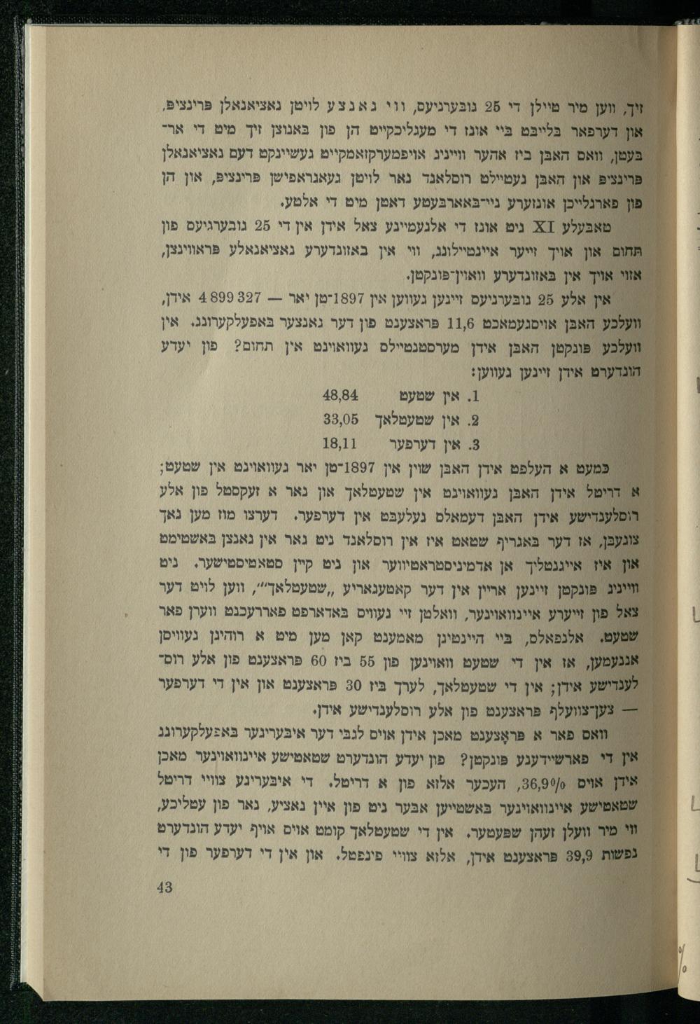 זיך. ווען מיר טיילן די 28 נובּערגיעס, ווי גאנצע לויטן נאציאנאלן פּרינציפּ, און דערפאר בּלייבּט בּיי אונז די מעגליכקייט הן פון כּאנוצן זיך מיט די ארי בּעטן, ואס האבּן ביז אהער ווייניג אויפמערקזאמקייט געשיינקט דעם נאציאנאלן פּרינציפּ און האבּן געטיילט רולאנד נאר לויטן געאגראפישן פּרינציפּ, און הן פון פארגלייכן אונזערע ניי-בּאארבּעטע דאפן מיט די אלטע. טאבּעלע ז 2 ניט אונז די אלנעמיינע צאל אידן אין די 28 גובערגיעס פון תּחום און אויך זייער איינטיילונג, וי אין באזונדערע נאציאנאלע פּראוויגצן, אזוי אויך אין בּאזונדערע וואוין-פּינקטן. אין אלע 28 נובּערניעס זיינען געווען אין 1897-מן יאר-- 327 4899 אידן, וועלכע האבּן אויסנעמאכט 11,6 פראצענט פון דער גאנצער בּאפעלקערונג. אין וועלכע פּונקטן האבּן אידן מערסטנטיילס געוואוינט אין תחום? פון יעדע הונדערט אידן זיינען געווען: 0 1. אין שטעט 24