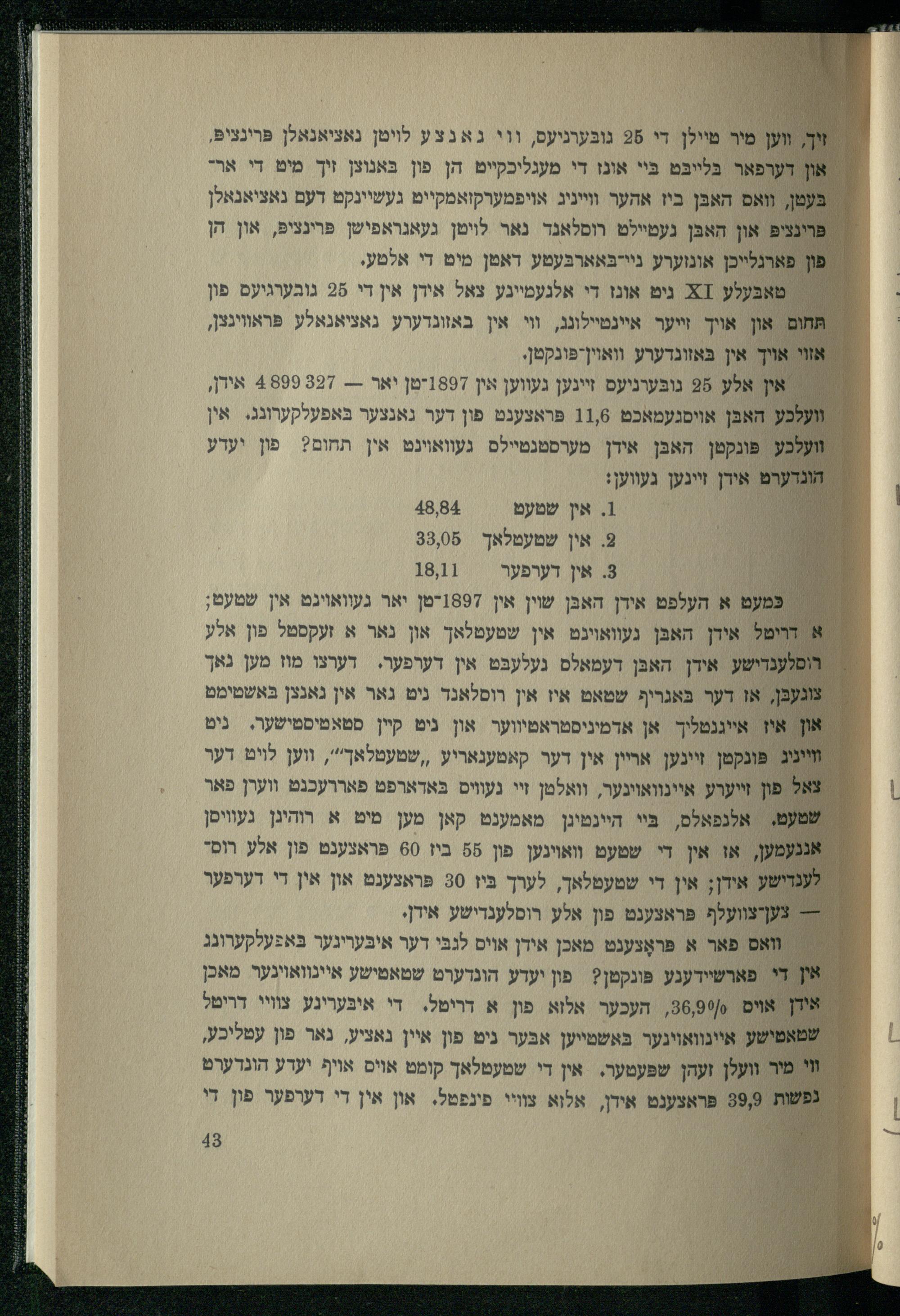 3 אין דערפער //18,11 כּמעט א העלפט אידן האבּן שוין אין 1897-טן יאר געוואויגט אין שטעט; א דריטל אידן האבּן נעוואוינט אין שטעטלאך און נאר א זעקסטל פון אלע רוסלענרישע אידן האבּן דעמאלס געלעבּט אין דערפער. דערצו מוז מען נאך צוגעבּן, אז דער בּאגריף שטאט איז אין רוסלאנד ניט גאר אין נאנצן בּאשטימט און אי אייננטליך אן אדמיניסטראטיווער און ניט קיין סטאטיסטישער. ניט וייניג פּונקטן זיינען אריין אין דער קאמענאריע ,,שטעטלאך"', ווען לוט דער צאל פון זײערע איינוואוינער, וואלטן זי געוויס בּאדארפט פאררעכנט ווערן פאר שטעם, אלנפאלם, בּיי היינטיגן מאמענט קאן מען מיט א רוהיגן געוויסן נעמען, או אין די שטעט וואוינען פון 8 ביז 60 פּראצענט פון אלע רוס" ננדישע אידן; אין די שטעפלאך, לערך כּיז 30 פראצענט און אין די דערפער = צעןצוועלף פראצענט פון אלע רוסלענדישע אידן. + וואס פאר א פּראָגענט מאכן אידן אויס לנבּי דער איבּעריגער בּאפעלקערונג און די פארשיידענע פּונקטן? פון יעדע הונדערט שטאטישע איינוואויגער מאכן איחן אױם /369, העכער אלוא פון א דריטל. די איבּערינע צוויי דריטל שטאטישע איינוואוינער בּאשמייען אבּער ניט פון איין נאציע, נאר פון עטליכע, : מור וועלן זעהן שפּעטער. אין די שטעטלאך קומט אויס אויף יעדע הונדערט נפשות 39,9 פראצענט אידן, אלוא צוויי פינפטל. און אין די דערפער פון די