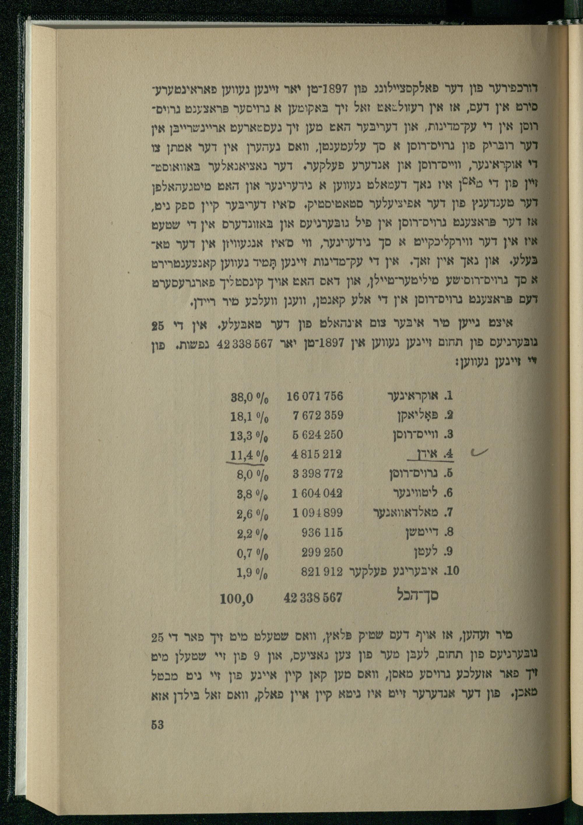 : איצט גייען סיר איבּער צום אינהאלט פון דער טאבּעלע. אין די 985 גובּערניעס פון תחום זיינען געווען אין 1897יטן יאר 42338867 נפשות. פון יי זיינען געווען: