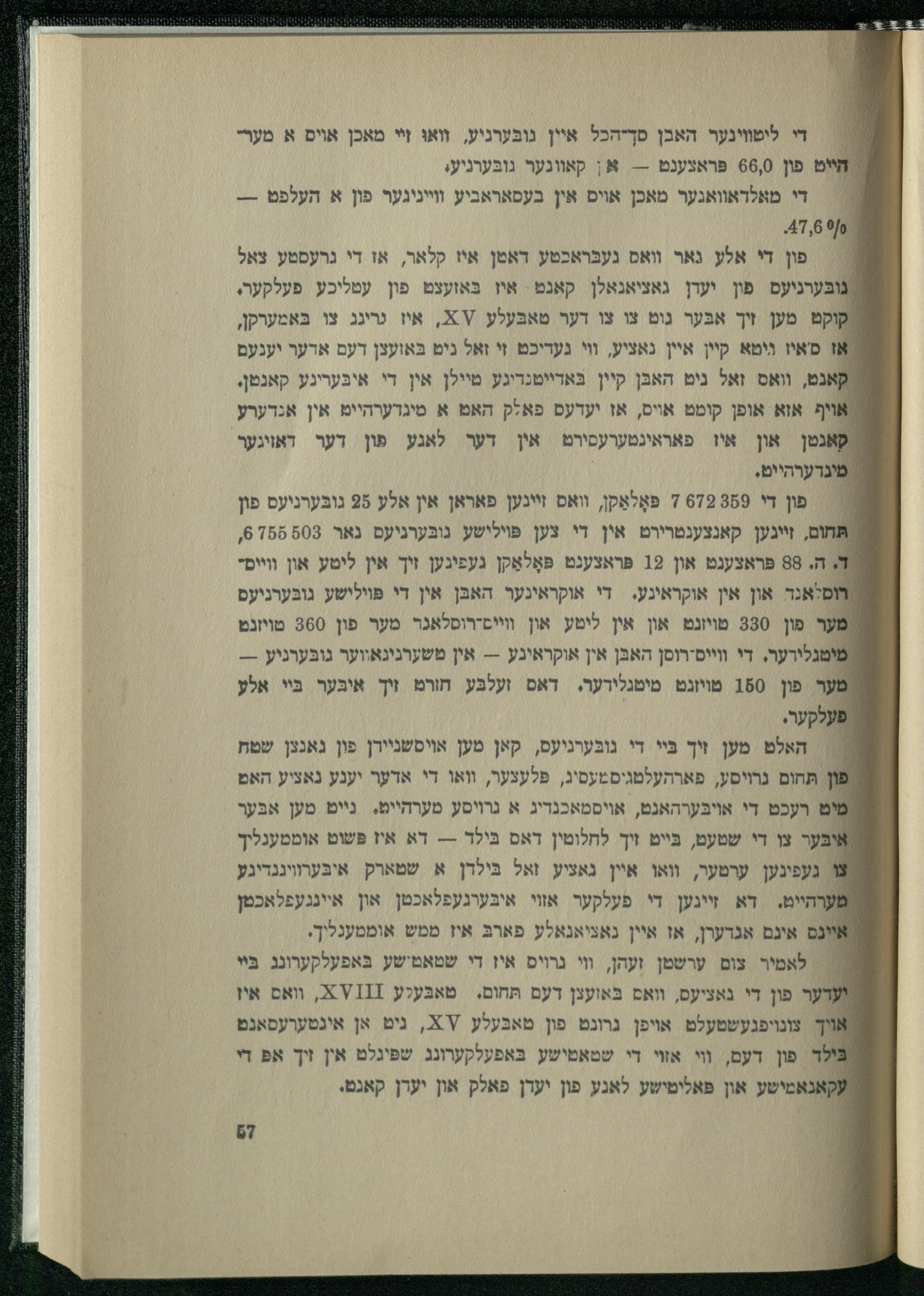 די ליטווינער האבן סך-הכל איין נובּערגיע, וואוּ זי מאכן אויס א מערהייט פון 66,0 פראצענט-- א{ קאוונער גובּערגיעג די מאלדאוואגער מאכן אוים אין בעסאראביע וייניגער פון א העלפט--47,60/0. || פון די אלע נאר וואס געבּראכטע דאטן איז קלאר, או די גרעסטע צאל גובּערניעם פון יעדן גאציאנאלן קאנט. איז בּאזעצט פון עטליכע פעלקער, קוקט מען זיך אבּער גוט צו צו דער טאבּעלע/ א איז גרינג צו בּאמערקן, אז סאיז וימא קיין איין נאציע, וי געדיכט זי זאל ניט בּאועצן דעס אדער יענעם נט, וואס זאל ניט האבּן קיין בּאדייטנדיגע טיילן אין די איבּערינע קאנטן, אויף אזא אופן קומט אויס, אז יעדעס פאלק האט א מיגדערהיימ אין אנדערע קאנטן און איז פאראינטערעסירט אין דער לאגע פון דער דאויגער מינדערהייט. פון די 389 679 7 פּאָלאַקן, וואס זיינען פאראן אין אלע 95 גובּערניעס פון תּחום, זיינען קאנצענטרירט אין די צען פּוילישע נובּערניעס נאר 503 1858 6, . ה. 88 פּראצענט און 19 פּראצענט פּאָלאַקן געפיגען זיך אין ליטע און ווייםהוסלאנד און אין אוקראיגע. די אוקראינער האבּן אין די פּוילישע נובּערגיעס מער פון 330 מויזנט און אין ליטע און ווייס-רוסלאגר מער פון 360 טויזנט טגלירער. די ווייס-רוסן האבּן אין אוקראיגע-- אין טשערניגאווער גובּערניע--ער פון 180 טויזנט מיטגלירער. דאס זעלבּע חור זיך איבּער בּיי אלץ עלקער. האלט מען זיך בּיי די נובּערניעס, קאן מען אויסשניירן פון גאנצן שטח תּחום גרויסע, פארהעלטגיסטעסיג, פּלעצער, וואו די אדער יענע נאציע האט מוט רעכט די אויבערהאנט, אויסמאכנדיג א גרויסע מערהייט.. גייט מען אבּער אובער צו די שטעט, בּייט זיך לחלוטין דאס בּילד-- דא איז פּשוט אומטענליך יצ געפינען ערטער, וואו איין נאציע זאל בּילדן א שטארק איבּערוויננדיגע / /פערהיים. דא זיינען די פעלקער אזוי איבּערגעפלאכטן און איינגעפלאכטן איינס אינם אגדערן, אז איין נאציאנאלע פארבּ איז ממש אומטענליך. לאמיר צום ערשטן זעהן, וי גרוים איז די שטאטישע בּאפעלקערונג בּיי ר פון די נאציעס, וואס בּאועצן דעם תּחום. טאבּעלע 9111 24, וואס איז יך צונויפגעשטעלט אויפן גרונט פון טאבּעלע /', ניט אן אינטערעסאנט ילקד פון דעם, וי אזוי די שטאטישע בּאפעלקערונג שפּיגלט אין זיך אפּ די אנאמישע און פּאליטישע לאנע פון יעדן פאלק און יערן קאגט.