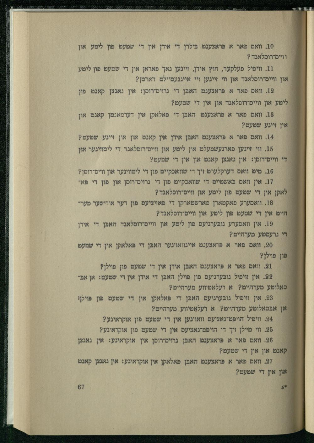 3. וואס פאר א פּראצענט האבּן די פּאלאקן אין דערמאנטן קאנט און אין זיינע שטעט? : 4. וואס פאר א פּראצענט האבּן אידן אין קאנט און אין זיינע שטעט? : 5 וי זיינען פארנעשטעלט אין ליטע און ווייס-רוסלאנד די ליטװינער און די ווייס-רוסן: אין גאנצן קאנט און אין די שטעט? ' 6. מיט וואס דערקלערט זיך די שוואכקייט פון די לימווינער און ווייס-רוסן? 7. אין וואס בּאשטייט די שוואכקייט פון די גרויסירוסן און פון די פא" ' לאקן אין די שטעט פון לימע און ווייס-רוסלאנר? ' 8. וואסערע פאקטארן פארשטארקן די פּאויציעס פון דער אידישער מערהייט אין די שטעט פון ליטע און ווייס-רוסלאנד? /19. אין וואסערע גובּערניעס פון ליטע און ווייסירוסלאנד האבן די אידן די גרעסטע מערהייט? }=|/20. ואס פאר א פראצענט איינוואוינער האבּן די פּאלאקן אין די שטעט פון פּױלן? 1. וואם פאר א פּראצענט האבּן אידן אין די שטעט פון פּױלן? 9. אין וויפיל גובּערגיעם פון פּױלן האבּן די אידן אין די שטעט: אן אבּסאלוטע מערהייט? א רעלאטיווע מערהייט?