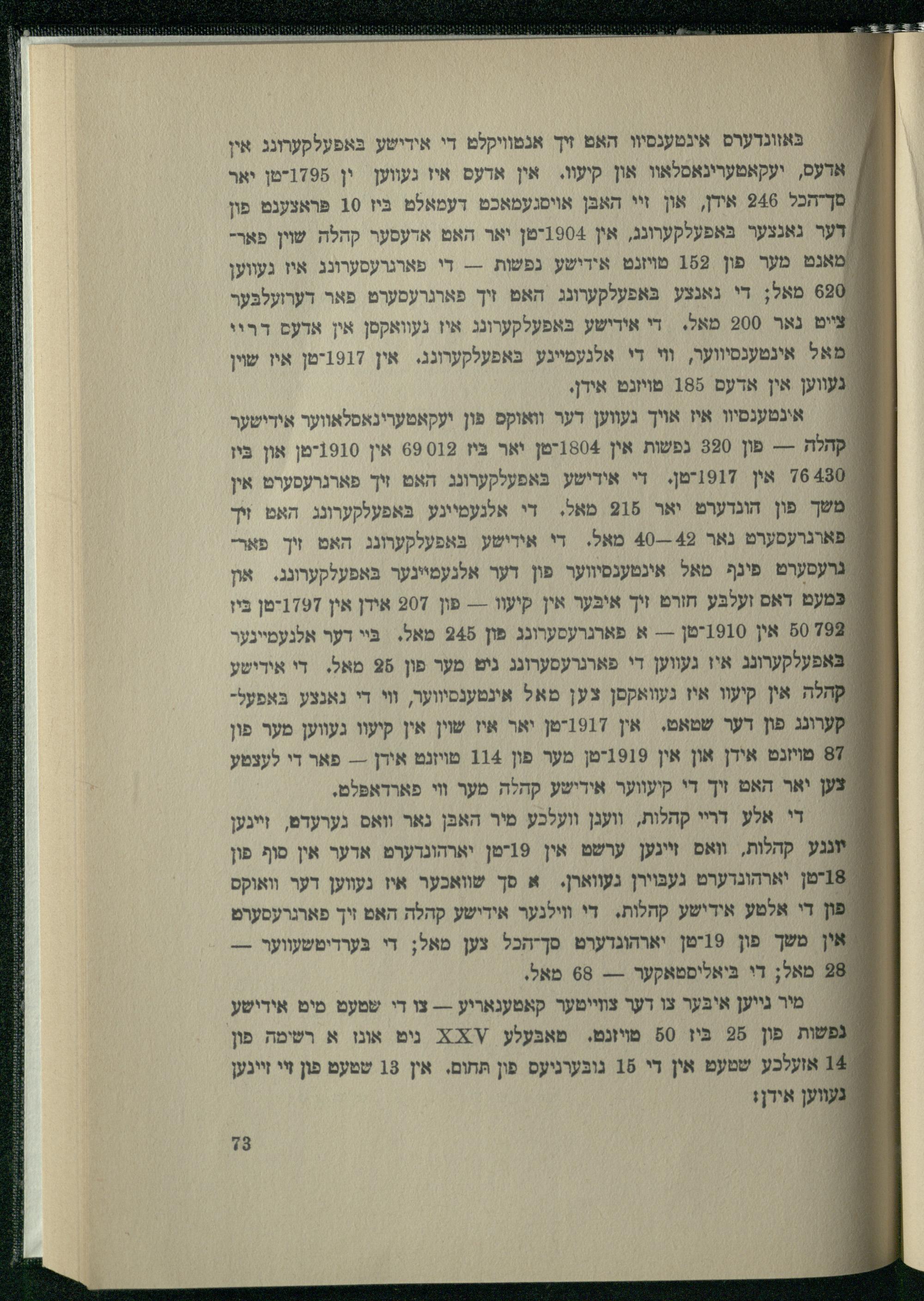 בּאזונדערס אינטענסיוו האט זיך אנטוויקלט די אידישע בּאפעלקערונג אין { אדעס, יעקאטערינאסלאוו און קיעוו. אין אדעס איז געווען ין 1798-טן יאר סך-הכל 246 אידן, און זי האבּן אויסנעמאכט דעמאלט גיז 10 פראצענט פון דער גאנצער בּאפעלקערונג, אין 1904-טן יאר האט אדעסער קהלה שוין פאר{/מאנט מער פון 182 טױזנט אידישע נפשות-- די פארגרעסערונג איז געווען 690 מאל; די גאנצע בּאפעלקערונג האט זיך פארגרעסערט פאר דערועלבּער ייט גאר 200 מאל. די אידישע בּאפעלקערונג איז געוואקסן אין אדעס דריי { מאל אינטענסיווער, וי די אלגעמיינע בּאפעלקערונג. אין 1917-טן איז שוין געווען אין אדעס 185 מויזנט אידן, : אינטענסיוו איז אויך געווען דער וואוקס פון יעקאטערינאסלאווער אידישער : קהלה-- פון 320 נפשות אין 1804-טן יאר בּיז 69019 אין 1910-טן און בּיז 430 6 אין 1917-טן. די אידישע בּאפעלקערונג האט זיך פארגרעסערט אין : משך פון הונדערט יאר 918 מאל. די אלנעמיינע בּאפעלקערונג האט זיך 7 פארנרעסערט נאר 42--40 מאל. די אידישע בּאפעלקערונג האט זיך פארגרעסערט פינף מאל אינמענסיווער פון דער אלגעמיינער בּאפעלקערונג. און מעט דאס זעלבּע חזרט זיך איכּער אין קיעוו-- פון 907 אידן אין 1797-טן בּין 38 80 אין 1910-טן-- א פארגרעסערונג פון 9248 מאל. בּיי דער אלנעמייגער בּאפעלקערונג איז געווען די פארגרעסערונג גיט מער פון 98 טאל. די אידישע קהלה אין קיעוו איז געוואקסן צען מאל אינטענסיווער, וי די גאנצץ בּאפעלקערונג פון דער שטאט. אין 1917-טן יאר איז שוין אין קיעוו געווען מער פון 87 טויזנט אידן און אין 1919יטן מער פון 114 טויזנט אידן-- פאר די לעצטע צען יאר האט זיך די קיעווער אידישע קהלה מער וי פארדאפּלט. די אלע דריי קהלות, וועגן וועלכע מיר האבּן נאר וואס גערעדט, זיינען יונגע קהלות, וואם זייגען ערשט אין 19-טן יארהונדערט אדער אין סוף פון 18יטן יארהונדערט געבּוירן געווארן. א סך שוואכער איז נעווען דער וואוקס פון די אלטע אידישע קהלות. די ווילנער אידישע קהלה האט זיך פארגרעסערט ין משך פון 19יטן יארהונדערט סך-הכל צען מאל; די בּערדיטשעווער--2 מאל; די בּיאליסטאקער--- 68 טאל, מיר גייען איבּער צו דער צווייטער קאטעגאריע-- צו די שטעט טיט אידישע נפשות פון 28 בִּיז 80 מױיזונט. מאבּעלע זא א ניט אונז א רשימה פון 14 אזעלכע שטעט אין די 18 גובּערניעס פון תּחום. אין 13 שטעט פון זי זיינען עווען אידן;