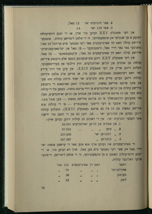 3. פאר הונדערט יאר 19 מאלן 3 פאר 110 יאר 4. |' אין דער מאבּעלע זי א א זעהען מיר אויך, או די יונגע דרום-קהלות וואקסן א סך שנעלער און אינטענסיווער, װי די אלטע לימווישע קהלות.= מינסקער אידישע קהלה האט זיך פארגרעסערט פאר דער נאנצער צייט סך-הכל 16 טאל; : אדנער גאר נאר דריי מאל; װיטעבּסקער-- 12 מאל און יעליסאוועטגראדער אידישע קהלה האט זיך פארנרעסערט 80 מאל; קרעמענטשונער--- 79 מאל. ' אין דער טאבּעלע:2 זיינען צונויפגענומען כּמעט אלע נרעסטע אידישע /קהלות פון אנהויבּ פון 19-טן יארהונדערט, חוץ ווילנער און בּערדיטשעווער, : לכע זייגען אריין אין דער טאבּעלע יזא א. און קוקן מיר דורך בּיירע גאר וואס דערמאנטע טאבּעלעס זעהען מיר, אז צווישן אלע אלטע אידישץ קהלות זייגען געווען צוריק מיט הונדערט יאר זעהר ווייניג קהלות מיט מער (פון פינף טויזנט אידישע נפשות. דורכשגיטליך האבּן פארמאנט די גרעסטע וישע קהלות פון 19-מן יארהונדערט צו דריי טויזנט נפשות. געמען מיר די קהלות טיט מער פון 10 טוזנט אידישע נפשות אין אנהויבּ פון 20-טן יארהונדערט, וועלן 1 ר בּאקומען דורכשגיטליך צו 30 טויזנט אידישע נפשות--- צען מאל מער. גײען מיר איבּער צו דער דריטער קאטעגאריע-- צו די קהלות מיט אידישע נפשות פון 10 בִּיז 29 טויזנט(טאבּעלע 1 א:2). אזעלכע קהלות גּען נעווען אין 1910-טן יאר-- 38. װענן 23 פון זי האבּן מיר ידיעות אר העכער הונדערט יאר. אין די דאזינע 23 קהלות זיינען געווען אידן! 1. אין אנהויבּ פון 19יטן יארהונדערט 000 34 3, מימן/, ,* 0 2 דס 8, 1897-טן יאר. 8 980 4, 910נימן, 7 387 די פארגרעסערונג איז געווען אויף אזא אופן פאר די ערשטע פופציג יאר מאל און פאר דער גאנצער צייט צען מאל. אויך דא זעהען מיר, או די גע דרום-קהלות וואקסן א סך אינטענסיווער, װי די אלטע לימווישע, רייסינער ער וואלינער קהלות. ראמני האט זיך פארנרעסערט 108 מאל פּאוולאגראד 79 כערסאן 38 לוצק 13