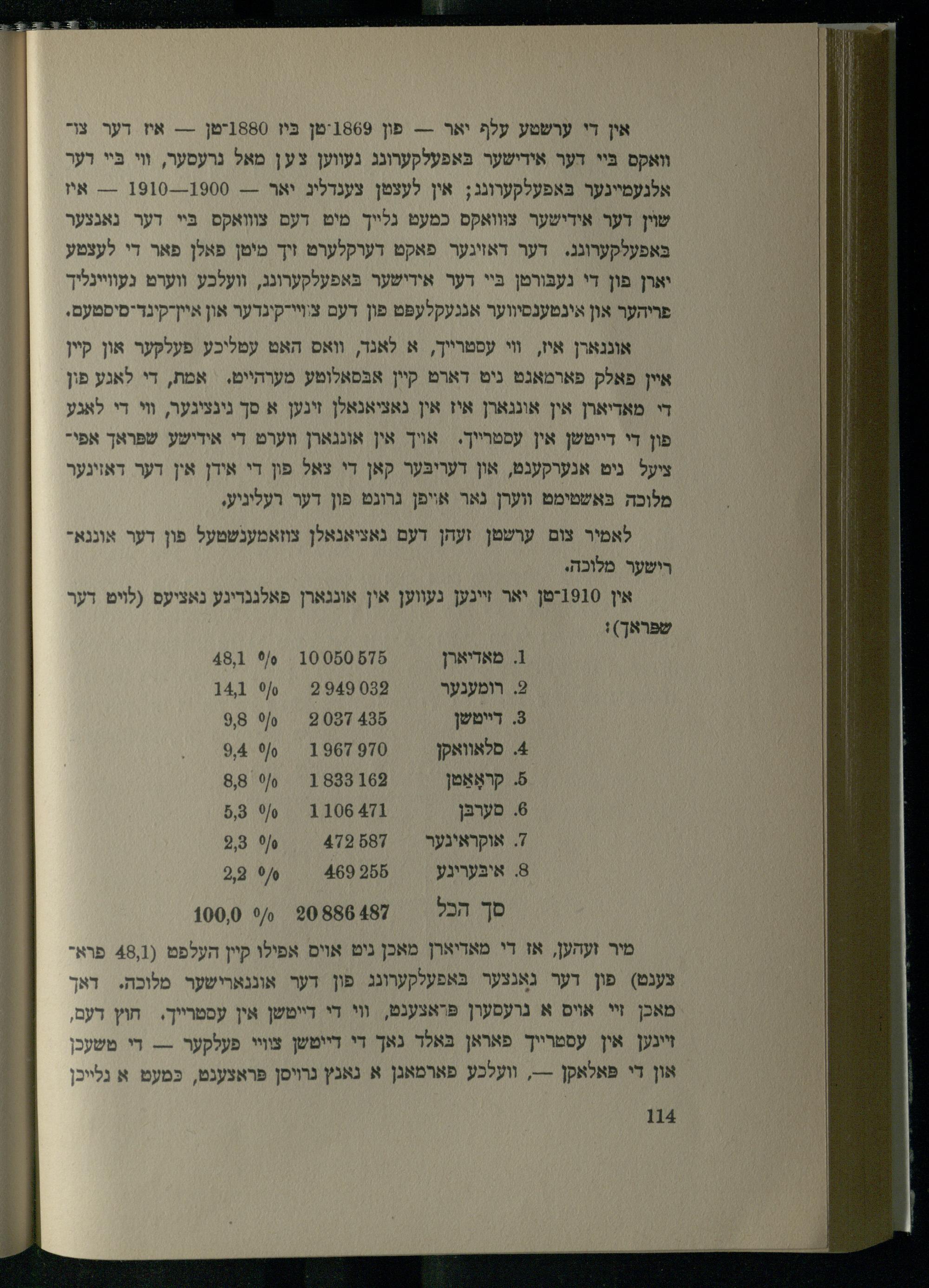 אונגארן איז, וי עסטרייך, א לאנד, וואס האט עטליכע פעלקער און קיין איין פאלק פארמאגט ניט דארט קיין אבּסאלוטע מערהייט.= אמת, די לאגע פון די מאדיארן אין אונגארן איז אין נאציאנאלן זינען א סך נינציגער, װי די לאגע פון די דייטשן אין עסטרייך. אויך אין אונגארן װערט די אידישע שפּראך אפיציעל ניט אנערקעגט, און דעריבּער קאן די צאל פון די אידן אין דער דאזינער מלוכה בּאשטימט ווערן נאר אויפן גרוגט פון דער רעליגיע.