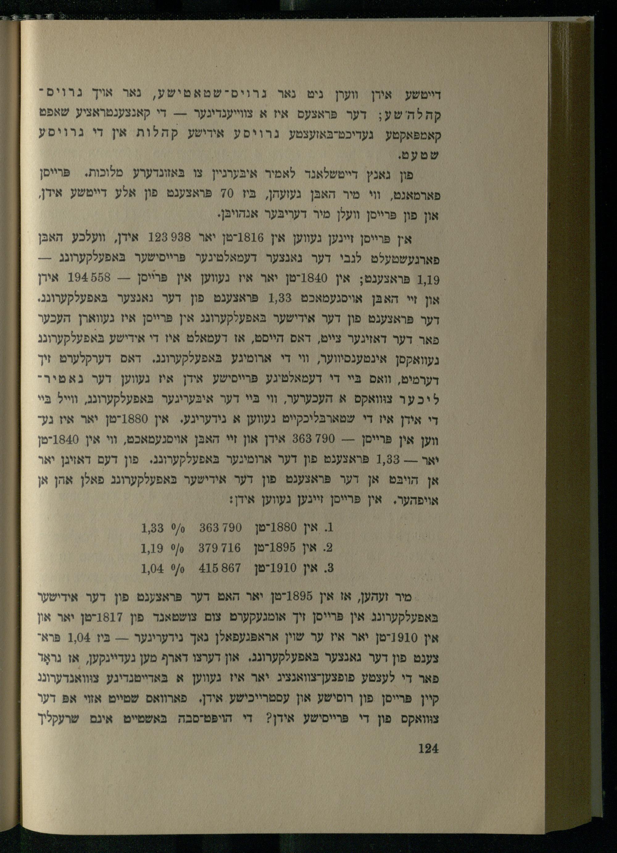 אין פּרייסן זיינען געווען אין 1816-טן יאר 988 198 אידן, וועלכע האבּן פארגעשטעלט לנבי דער גאנצער דעמאלטיגער פּרייסישער בּאפעלקערונג--9 פּראצענט; אין 1840-טן יאר איז געווען אין פּרײיסן-- 194888 אירן און זײ האבּן אויסגעמאכט 1,83 פּראצענט פון דער נאנצער בּאפעלקערונג. דער פּראצענט פון דער אידישער באפעלקערונג אין פּרײיסן איז געווארן העכער פאר דער דאזיגער צייט, דאס הייסט, אז דעמאלט איז די אידישע בּאפעלקערונג נעוואקסן אינטענסיווער, וי די ארומיגע בּאפעלקערונג. דאס דערקלערט זיך דערמיט, וואס בּיי די דעמאלטיגע פּרײסישע אידן איז געווען דער גאמירליכער צווואקס א העכערער, וי בּיי דער איבּעריגער בּאפעלקערונג, ווייל בּיי די אידן איז די שטארבּליכקייט געווען א נידעריגע. אין 1880-טן יאר איז געך ווען אין פּרייסן--- 790 368 אידן און זי האבּן אויסגעמאכט, וי אין 1840-טן יאר--- 1,838 פראצענט פון דער ארומינער בּאפעלקערונג. פון דעם דאזיגן יאר אן הויבּט אן דער פּראצענט פון דער אידישער כּאפעלקערונג פאלן אהן אן אויפהער. אין פּרײסן זיינען געווען אידן: