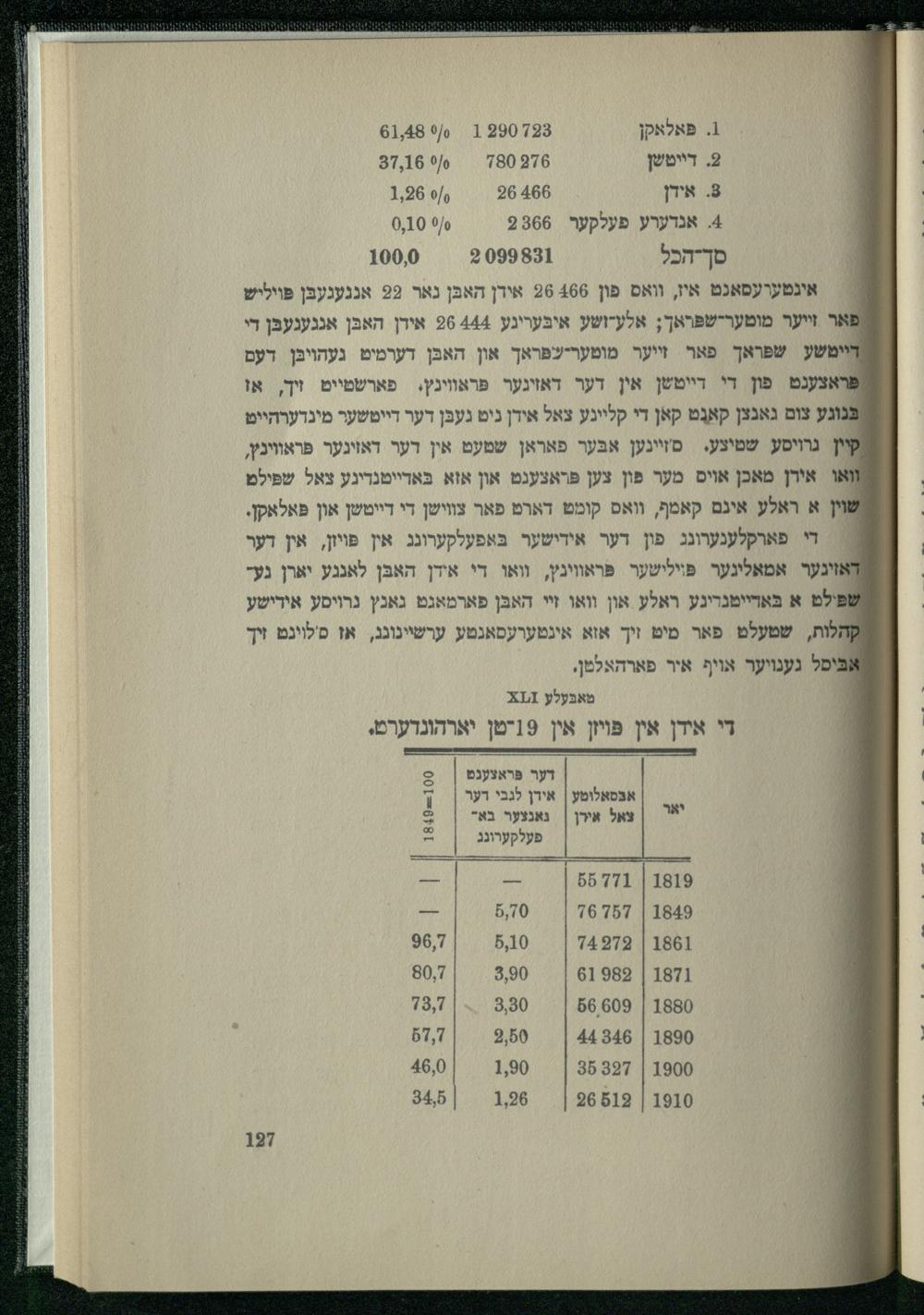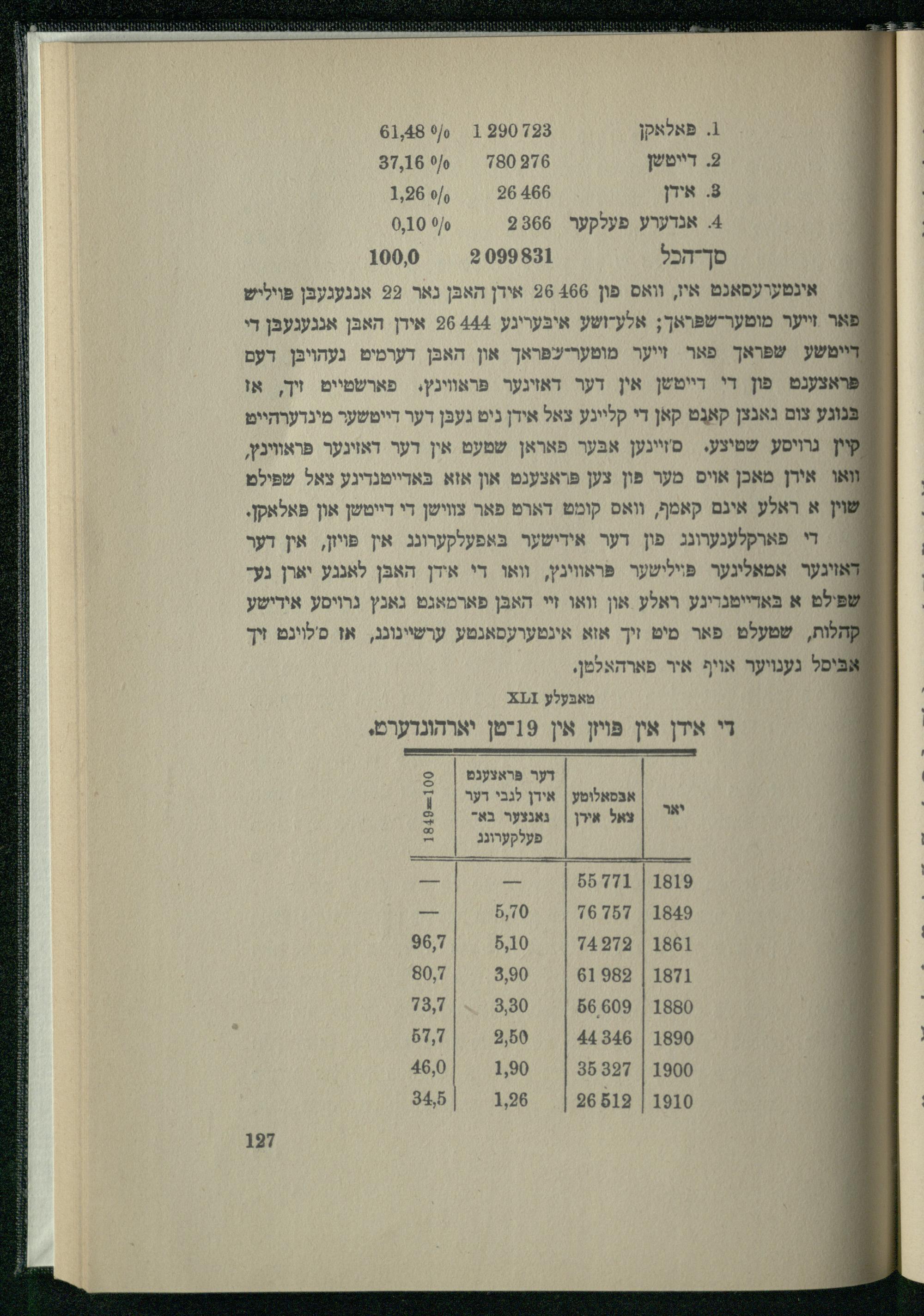 1. פּאלאקן 2903 1 /61,480/0 2 דייטשן 6=|)87,16)/0 3 אידן 266(/ס 1,96 4 אנדערע פעלקער 9866 9 0,10 סך-הכל 31 /1000 אינטערעסאנט איז, וואס פון 466 26 אידן האבּן נאר 29 אנגעגעבּן פּויליש ' אר זייער מוטער-שפּראך; אלע-ושע איבּעריגע 444 26 אידן האבּן אנגענעבּן די דיימשע שפּראך פאר זייער מוטעריעפראך און האבּן דערמיט געהויבּן דעם /פראצענט פון די דייטשן אין דער דאזינער פּראווינץ. פארשטייט זיך, או בּנוגע צום גאנצן קאנְט קאן די קליינע צאל אידן ניט געבּן דער דייטשער מינדערהייט װין גרויסע שטיצע. סזיינען אבּער פאראן שטעט אין דער דאזיגער פּראווינץ, ואו אירן מאכן אויס מער פון צען פּראצענט און אזא בּאדייטנדיגע צאל שפּילט שוין א ראלע אינם קאמף, וואס קומט דארט פאר צווישן די דייטשן און פּאלאקן. : די פארקלענערונג פון דער אידישער בּאפעלקערונג אין פּױון, אין דער : זינער אמאלינער פּוילישער פֿראווינץ, וואו די אידן האבּן לאנגע יארן געשׁפּילט א בּאריימנרינע ראלע און וואו זי האבּן פארמאגט גאנץ גרויסע אידישע 2 קלות, שטעלט פאר מיט זיך אזא אינטערעסאנטע ערשיינונג, אז סלויגט זיך אבּיסל גענויער אויף איר פארהאלטן, טאבּעלע זוז: די אידן אין פּױזן אין 19יטן יארהונדערט,