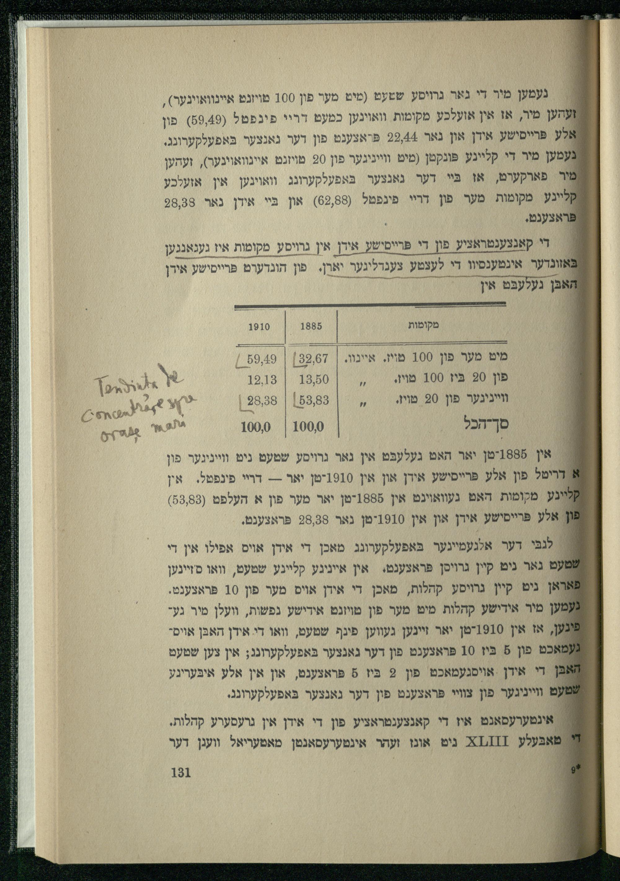 לנבּי דער אלגעמיינער בּאפעלקערונג מאכן די אידן אויס אפילו אין די : ט גאר נִיט קיין גרויסן פראצענט. אין אייניגע קליינע שטעט, וואו סזיינען א אראן יט קֵיין גרויסע קהלות, מאכן די אידן אויס מער פון 10 פּראצענט. מע מיר אידישע קהלות מיט מער פון מױיונט אידישע נפשות, וועלן מיר גע" אז אין 1910-טן יאר זיינען געווען פינף שטעט, וואו די. אידן האבּן אויםמאכט פון 5 בִּיז 10 פראצענט פון דער גאנצער בּאפעלקערונג; אין צען שטעט אב די אירן אויסגעמאכט פון 2 בּיז 5 פּראצענט, און אין אלע איבּעריגץ מעט ווייניגער פון צוויי פראצענט פון דער גאנצער באפעלקערונג.