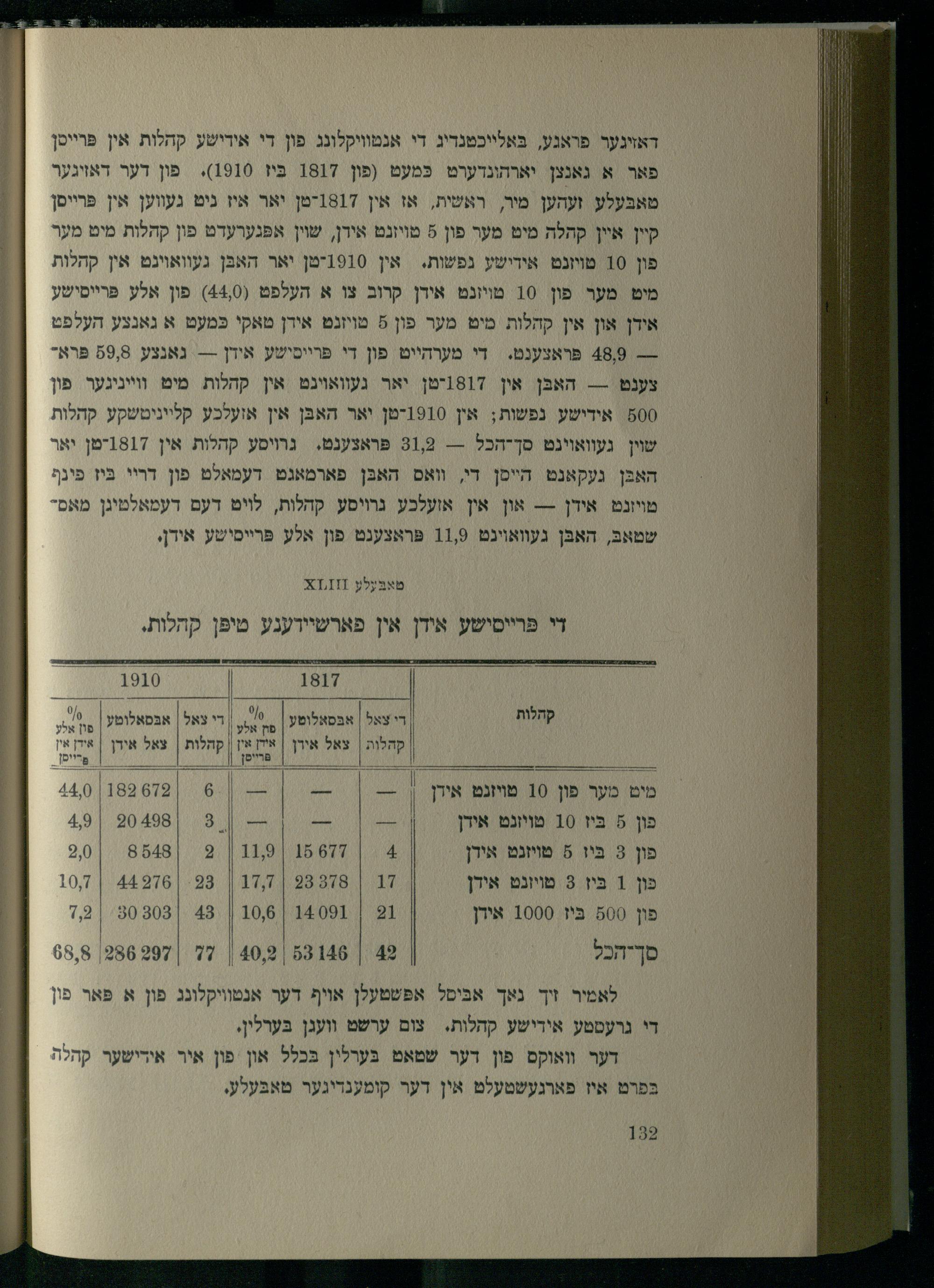 דאזיגער פראנע, בּאלייכטנדיג די אנמוויקלונג פון די אידישע קהלות אין פּרייסן פאר א גאנצן יארהונדערט כּמעט(פון 1817 יז 1910). פון דער דאזיגער מאבּעלע זעהען מיר, ראשית, אז אין 1817-טן יאר איז ניט געווען אין פּרײיסן קיין אײין קהלה מיט מער פון 5 מויזנט אירן, שוין אפּגערעדט פון קהלות מיט מער פון 10 טוזנט אידישע נפשות. אין 1910-טן יאר האבּן געוואוינט אין קהלות מיט מער פון 10 מויזנט אידן קרוב צו א העלפט(44,0) פון אלע פּרײסישע אידן און אין קחלות מיט מער פון 5 מויזנט אידן טאקי כּמעט א גאנצע העלפט -- 48,9 פּרואצענט. די מערהייט פון די פּרייסישע אידן-- גאנצע 89,8 פראצענט--- האבּן אין 1817ימן יאר געוואויגט אין קהלות מיט ווייניגער פון 0 אידישע נפשות; אין 1910-טן יאר האבּן אין אזעלכע קלייניטשקע קהלות שוין געוואוינט סך-הכל--- ,81 פראצענט. גרויסע קהלות אין 1817-טן יאר האבּן געקאנט הייסן די, וואס האבן פארמאנט דעמאלט פון דריי בּיז פינף מויזנט אידן--- און אין אזעלכע גרויסע קהלות, לוט דעם דעמאלטיגן מאסשטאבּ, האבּן געוואוינט 11,9 פּראצענט פון אלע פּרייסישע אידן,