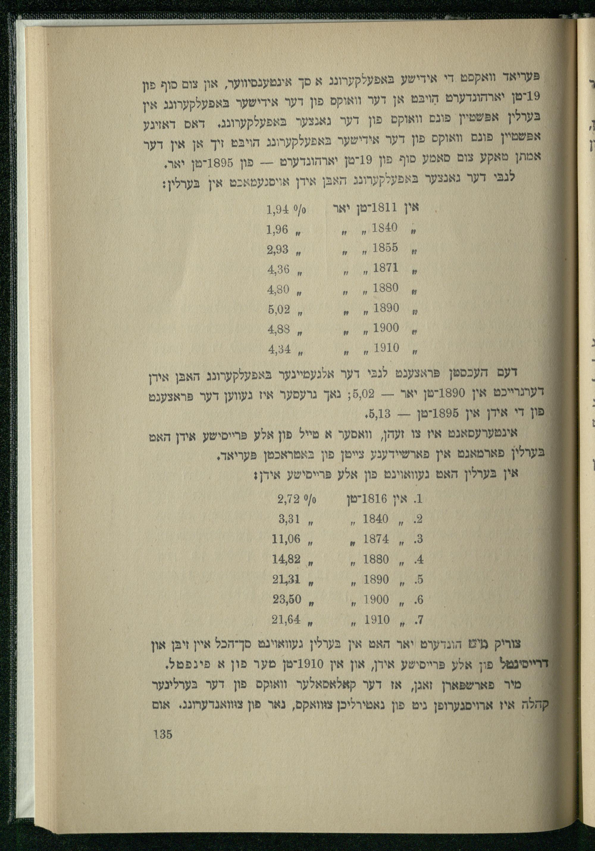 0, 9164 : צוריק מיט הונדערט יאר האט אין בּערלין געוואוינט סך-הכל איין זיבּן און ח יסינטל פון אלע פּרײסישע אירן, און אין 1910יטן מער פון א פינפטל. == מיר פארשפארן זאגן, או דער קאלאסאלער וואוקס פון דער בערלינער קהלה איז ארויסגערופן ניט פון נאטירליכן צווואקס, נאר פון צווואנרערונג. אום
