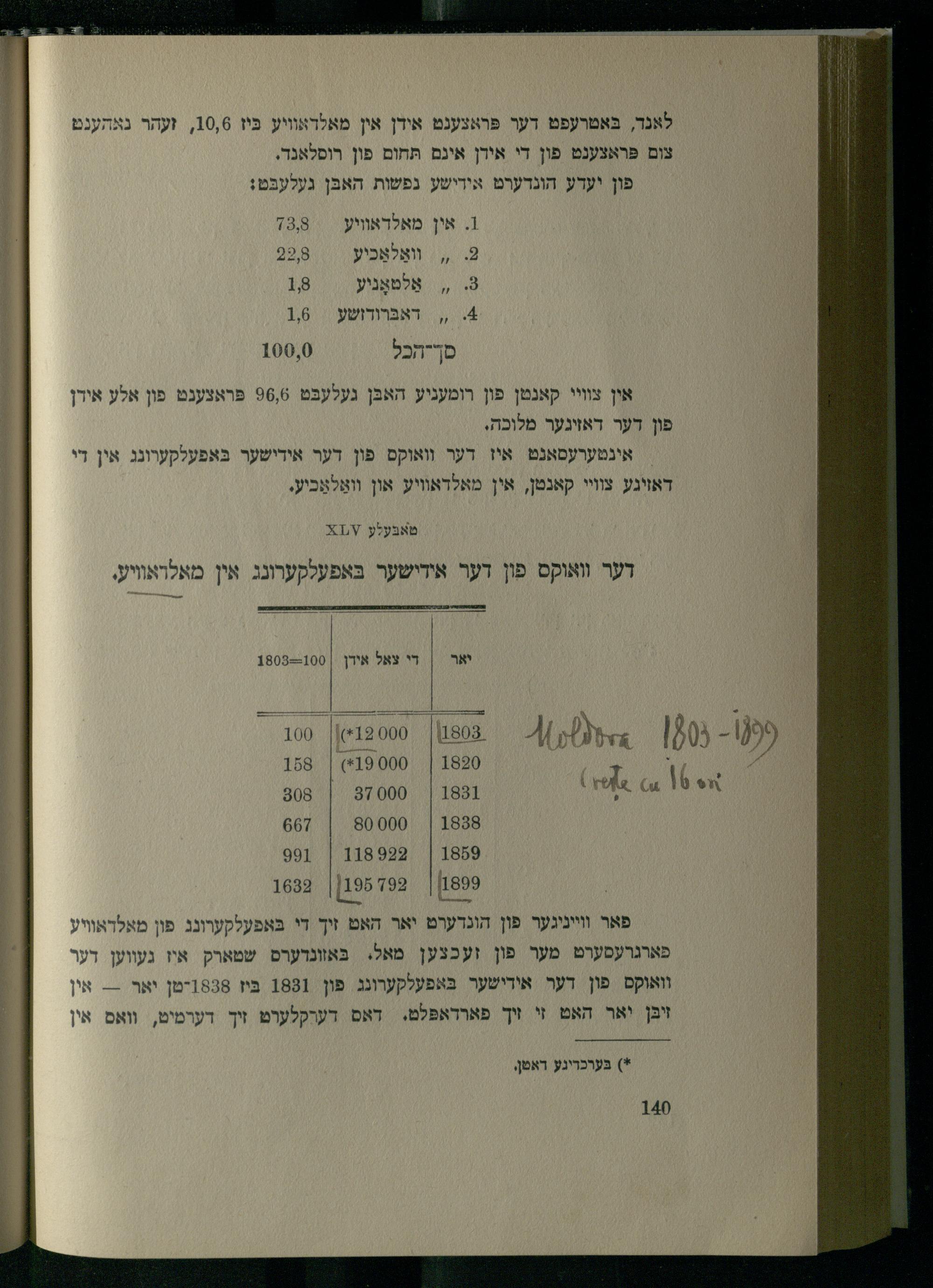לאנד, בּאטרעפט דער פּראצענט אידן אין מאלדאוויע כּיז 10,6, זעהר גאהענט צום פּראצענט פון די אידן אינם תּחום פון רוסלאנד. פון יעדע הונדערט אידישע נפשות האבּן געלעבּט: 1. אין מאלדאוויע // 788 2, װאַלאַכיע 228 3 ,, אַלטאָניע 18 4, דאבּרודושע 166 סן-הכל 1000 און צוויי קאנטן פון רומעניע האבּן געלעבּט 96,6 פּראצענט פון אלע אידן פון דער דאזיגער מלוכה. אינטערעסאנט. איז דער וואוקס פון דער אידישער בּאפעלקערונג אין די דאזיגע צוויי קאנטן, אין מאלדאוויע און װאַלאַכיע.