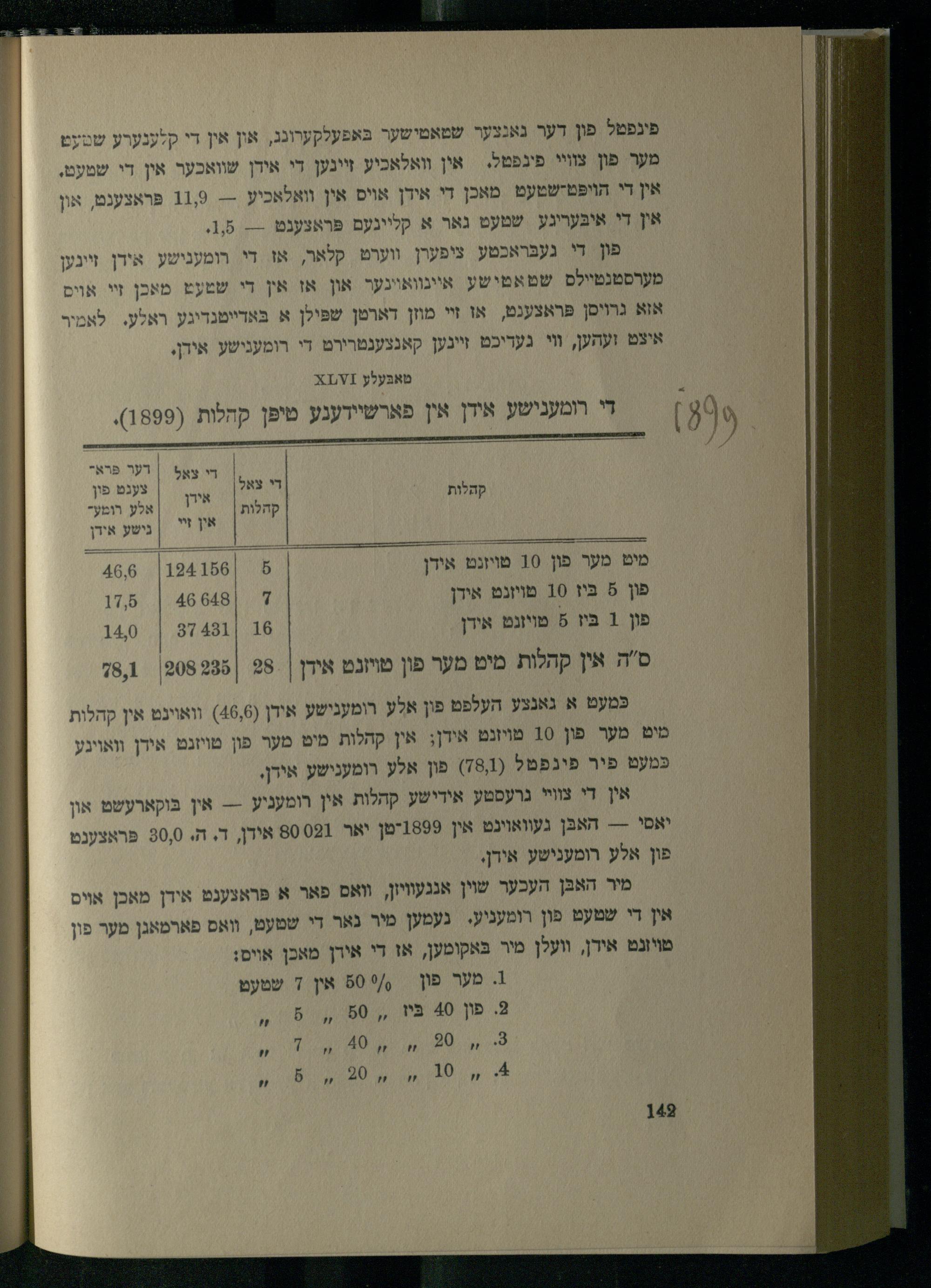כּמעט א גאנצע העלפט פון אלע רומעגישע אידן(46,6) וואוינט אין קהלות מיט מער פון 10 פױיזנט אידן; אין קהלות מיט מער פון מויזנט אידן וואויגץ כּמעט פיר פינפטל(78,1) פון אלץ רומענישע אידן, אין די צװײ גרעסטע אידישע קהלות אין רומעניע--- אין בּוקארעשט און יאסי--- האבּן געוואוינט אין 1899יטן יאר 80021 אידן, ד. ה. 20,0 פּראצענט פון אלע רומענישע אידן. מיר האבּן העכער שוין אנגעוויזן, וואס פאר א פּראצענט אידן מאכן אױס אין די שטעט פון רומעניע. נעמען מיר גאר די שמעט, וואס פארמאגן מער פון טויונט אירן, וועלן מיר בּאקומען, אז די אידן מאכן אויס: 1 מער{/80 אין 7 שטעט 3 פון 40 בי ,, 50 ,, 8 2 ח 0ל..)יי. 7י, 10 0ל, 6,