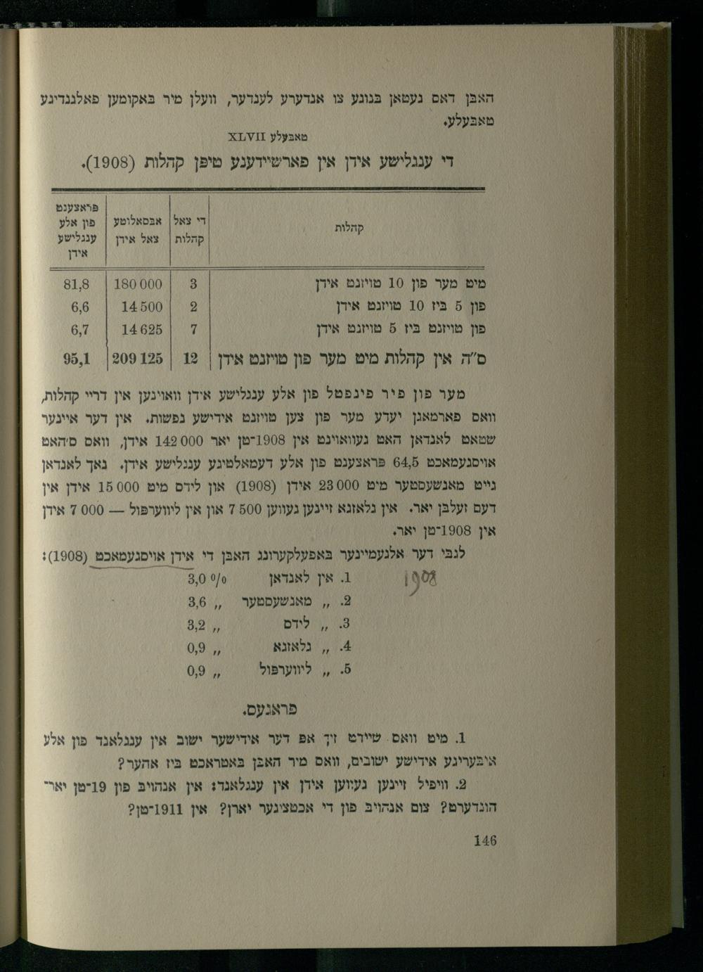 1. מיט וואס. שיידט זיך אפּ דער אידישער ישוב אין ענגלאנד פון אלע איבּעריגע אידישע ישובים, וואס מיר האבן בּאטראכט כּיז אהער? 2. וויפיל זיינען געווען אירן אין ענגלאנד: אין אנהויבּ פון 19יטן יאר" הונדערט? צום אנהויבּ פון די אכטציגער יארן? אין 1911-טן?