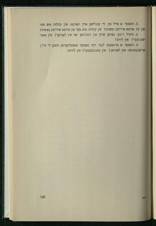 3 וואסער א טייל פון די ענגלישע אידן וואוינט: אין קהלות מיט מער פון 10 מויזנט אידישע נפשות? אין קהלות מיט מער פון טויזנט אידישע נפשות? ' 4 וויפיל זיינען געווען אידן אין 1908-טן יאר אין לאָנדאָן? אין מאנשעכטער? אין לירם? ו 8 וואסער א פראצענט לנבּי דער גאנצער באפעלקערונג האבּן די אידן אויסגעמאכט: אין לאנדאן? אין מאנשעסטער? אין לירם?