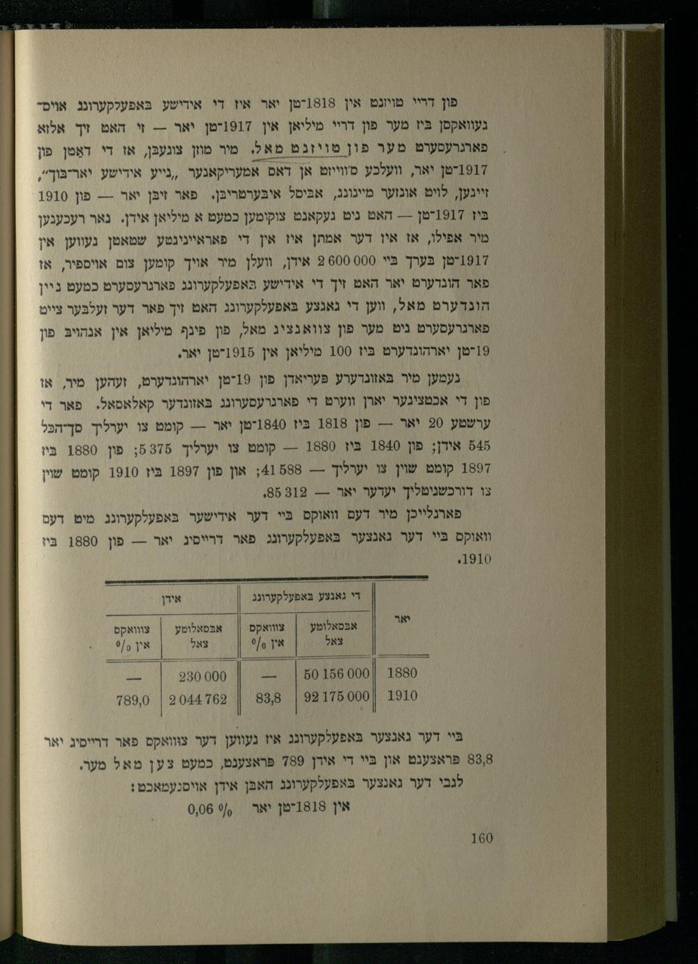 פון דריי טויזנט אין 1818-טן יאר איז די אידישע בּאפעלקערונג אויםגעוואקסן בּיז מער פון דריי מיליאן אין 1917-טן יאר-- זי האט זיך אלוא פארנרעסערט מער פון טויזגט מאל. מיר מוון צוגעבּן, אז די דאַטן פון 7טן יאר, וועלכע סווייזט אן דאס אמעריקאנער נייע אידישע יאר-בּוך", זיינען, לוט אונזער מיינונג, אבּיסל איבּערטריבּן. פאר זיבּן יאר--- פון 1910 בּיו 1917-טן-- האט ניט געקאנט צוקומען כמעט א מיליאן אידן. נאר רעכענען מור אפילו, אז איז דער אמתן איז אין די פאראיינינטע שמאטן נעווען אין 17טן בּערך בּיי 000 2600 אידן, װעלן מיר אויך קומען צום אויספיר, אז פאר הונדערט יאר האט זיך די אידישע כּאפעלקערונג פארנרעסערט כמעט ניין הונדערט מאל, ווען די גאגצע בּאפעלקערונג האט זיך פאר דער זעלבּער צייט פארגרעסערט ניט מער פון צוואנציג מאל, פון פינף מיליאן אין אנהויבּ פון 9טן יארהונדערט בּיז 100 מיליאן אין 1918-טן יאר,