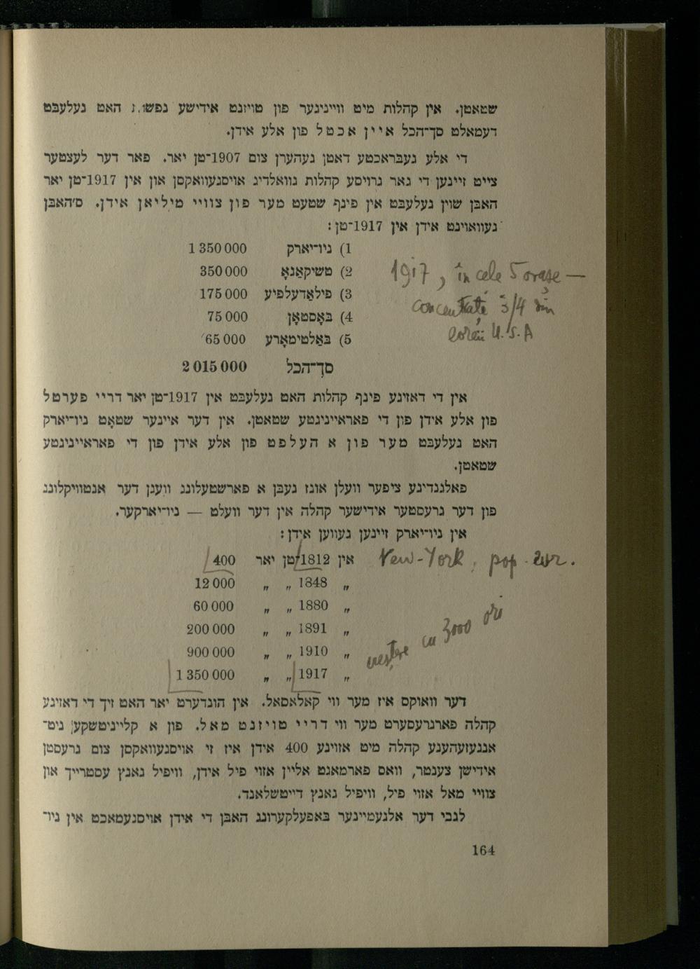 אין די דאזינע פינף קהלות האט געלעכּט אין 1917-טן יאר דריי פערוטל פון אלע אידן פון די פאראייניגטע שטאטן. אין דער איינער שטאָט גיו-יארק האט נעלעבּט מעו פון א העלפט פון אלע אידן פון די פאראייניגטע שטאטן. פאלננדינע ציפער וועלן אונז געבּן א פארשטעלונג וועגן דער אנטוויקלונג פון דער גרעסטער אידישער קהלה אין דער וועלט--- ניו-יארקער. אין ניו-יארק זיינען געווען אידן: .ופ. וין עש/-=ס/ אין 9טן יאר 400 8,, 1500 7 1280 0 60 / 0 1201 0 900 יא ן 1210 0 900 17))| 00 1 דער וואוקס איז מער וי קאלאסאל.- אין הונדערט יאר האט זיך די דאויגץ קהלה פארנרעסערט מער וי דריי מויונט מאל. פון א קלייניטשקע! ניטאנגעזעהענע קהלה מיט אזוינע 400 אידן איז זי אויסגעוואקסן צום גרעסטן אידישן צענטר, וואס פארמאנט אליין אזוי פיל אידן, וויפיל גאנץ עסטרייך און צוויי מאל אזוי פיל, וויפיל גאנץ דייטשלאנד, לנבי דער אלגעמיינער בּאפעלקערונג האבּן די אידן אויסגעמאכט אין גיו
