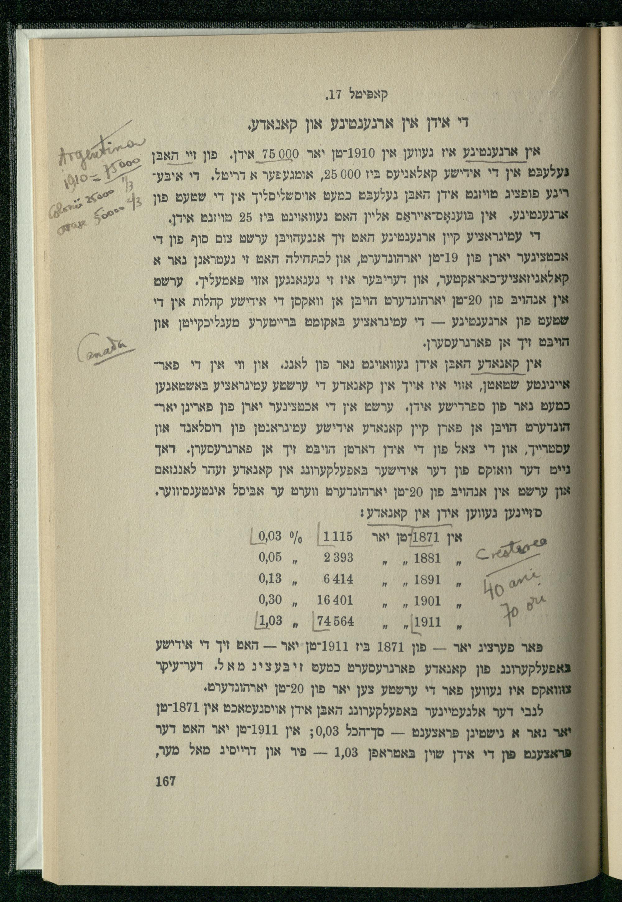 אין ארנענטינע איז געווען אין 1910-טן יאר 78000 אירן. פון זי האבן.=, עי געלעכט אין די אידישע קאלאניעס בּיז 000 28, אומגעפער א דריטל. די איבּע(רינע פופציג מויונט אידן האבּן געלעּט כמעט אויסשליסליך אין די שטעט פון יארגענטינע. אין בּוענאָס-אײראַם אליין האט געוואוינט בּיז 98 טויזנט אידן. די עמיגראציע קיין ארגענטינע האט זיך אנגעחויבּן ערשט צום סוף פון די מציגער יארן פון 19ימן יארהונדערט, און לכתּחילה האט זי געטראגן נאר א קאלאניזאציע-כאראקטער, און דעריבּער איז זי גענאנגען אזוי פּאמעליך. ערשט און אנהויבּ פון 20-טן יארהונדערט הויבּן אן וואקסן די אידישע קהלות אין די שטעט פון ארנענטינע--- די עמינראציע בּאקומט בּרייטערע מעגליכקייטן און הויבּט זיך אן פארגרעסערן. אין קאנאדע האבּן אידן געוואויגט נאר פון לאנג. און װי אין די פאראיינינטע שטאטן, אזוי איז אויך אין קאנאדע די ערשטע עטיגראציע בּאשטאגען עט נאר פֿון ספררישע אידן. ערשט אין די אכטצינער יארן פון פאריגן יארנדערם הויבּן אן פארן קיין קאנאדע אידישע עמיגראנטן פון רוסלאנד און עפטרייך, און די צאל פון די אידן דארטן הויבּט זיך אן פארגרעסערן. ראך נוים דער וואוקם פון דער אידישער כּאפעלקערונג אין קאנאדע זעהר לאנגזאם ערשט אין אנהויבּ פון 20-טן יארהונדערט ווערט ער אבּיסל אינטעגסיווער, סזיינען געווען אידן אין קאנארע{ און 1871ץפן יאר 1118| ,|ס 0,08, =:8סן, ,/ 2803=, 005 ייט) ,1801,/ 6414=, 018 , ,1901- /16401, 030 " פן ענפן,,/ 74864|, 1203| = פאר פערציג יאר-- פון 1871 בּיז 1911-טן. יאר-- האט זיך די אירישע פעלקערונג פון קאנאדע פארנרעסערט כמעט זיבּעציג מאל. רעריעיקר קם איז געווען פאר די ערשטע צען יאר פון 20יטן יארהונדערט, לנבי דער אלגעמיינער בּאפעלקערונג האבּן אידן אויסגעמאכט אין 1871-טן גנאר א נישטינן פּראצענט-- סך"הכל 0,08; אין 1911-טן יאר האט דער ענם פון די אידן שוין בּאמראפן 1,03--- פיר און דרייסיג מאל מער,