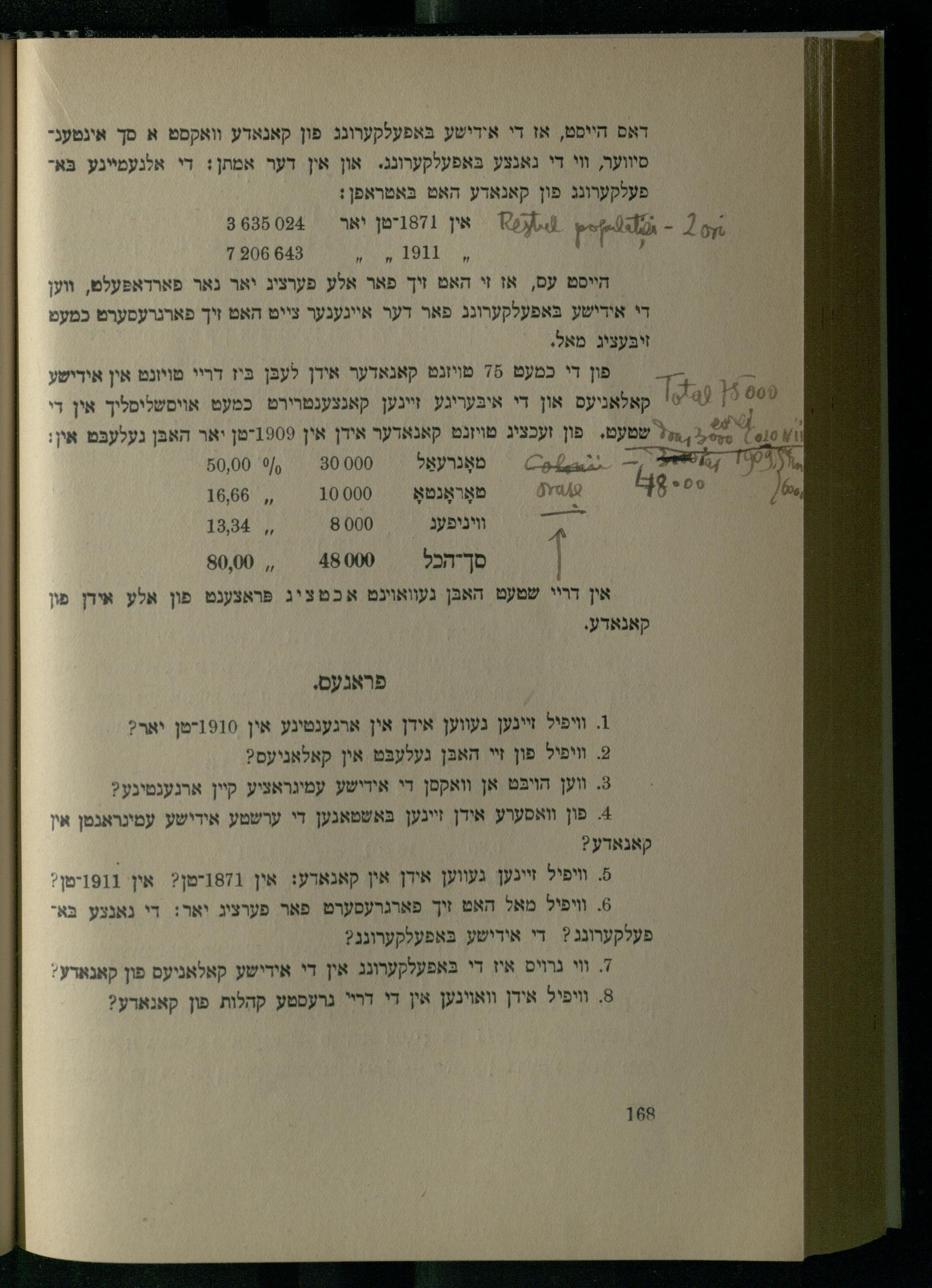 דאס הייסט, אז די אידישע בּאפעלקערונג פון קאנאדע וואקסט א סך אינטענסיווער, וי די גאנצע בּאפעלקערונג. און אין דער אמתן: די אלנעמיינע באה פעלקערונג פון קאנאדע האט בּאטראפן: - 4:15-יץ ,א אין 1871יטן יאר 8635094 יי 1911'י 83 906 7 הייסט עס, אז זי האט זיך פאר אלע פערציג יאר נאר פארדאפּעלט, ווען די אידישע בּאפעלקערונג פאר דער אייגענער צייט האט זיך פארנרעסערט כמעט זיבּעציג מאל. = פון די כבמעט 15 טויזנט קאנאדער אידן לעבּן ביז דריי מויונט אין אידישע 0 0' קאלאניעס און די איבּעריגע זיינען קאנצענטרירט כמעט אויסשליסליך אין די וו 2 יו ל,: חל" טי פון זעבציע טויזנט קאנאדער אידן אין 1909-טן יאר האבּן געלעבּט אין ן! מאָנרעאַל // 80000= ,0 80,00 טאָראָנטאָ 10000= ,, 16,666 וויניפעג 0 8, 1384 סךיהכל/ 48000 2, 80,00 און דריי שטעט האבּן געוואוינט אכטציג פּראצענט פון אלע אידן פו קאנאדע.