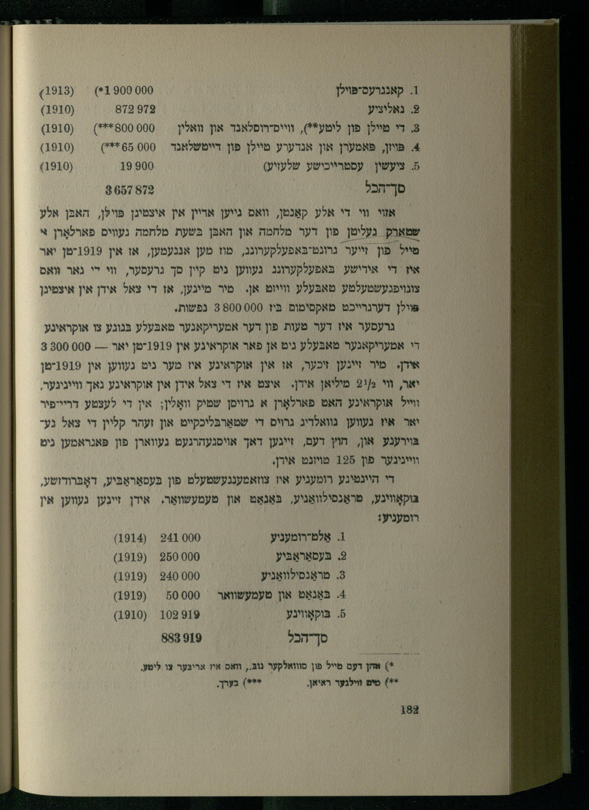1. קאנגרעסיפּױלן 0 וײ)=(1918) 9 נאליציע 89(1910) 3 די מיילן פון לימע**), ווייס-רוסלאנד און ואלין 800000***)(1910) 4 פּױזן, פאמערן און אנדערע טיילן פון דייטשלאנד 000 65**")(1910) ציעשין עסטרייכישע שלעזיע) 190(1910) סךהכל 79 687 8 אזוי װי די אלע קאַנטן, וואס נייען אריין אין איצטיגן פּױלן, האבן אלע שטארק געליטן פון דער מלחמה און האבּן בּשעת מלחמה געווים פארלאָרן* מייל. פון זייער גרונט-באפעלקערונג, מוז מען אננעמען, אז אין 1919-טן יאר איז די אירישע באפעלקערונג נעווען ניט קיין סך גרעסער, וי די נאר וואס צונויפגעשטעלטע מאבּעלע ווייזט אן.= מיר מיינען, אז די צאל אידן אין איצמיגן פּולן דערנרייכט מאקסימום בּיז 3800000 נפשות, גרעסער איז דער טעות פון דער אמעריקאנער טאבּעלע בּנוגע צו אוקראינע די אמעריקאנער טאבעלע ניט אן פאר אוקראינע אין 1919-טן יאר--- 000 300 3 אודן. מיר זיינען זיכער, אז אין אוקראינע איז מער ניט געווען אין 1919-מן יאר, וי 2:/2 מיליאן אידן. איצט איז די צַאל אידן אין אוקראינע נאך ווייניגער, ווייל אוקראינע האט פארלאָרן א גרויסן שמיק װאָלין; אין די לעצטע דריייפיר יאר איז געווען נוואלריג גרויס די שטאַרבּליכקײט און זעהר קליין די צאל געבּוירענע און, חוץ דעם, זיינען דאך אויסנעהרגעט געווארן פון פּאגראמען גיט ווייניגער פון 128 מויזנט אידן, די היינטינע רומעניע איז צוזאמענגעשטעלט פון בּעסאַראַבּיע, דאָבּרורושע, בוקאָװינע, טראַנסילװאַניע, בּאַנאַט און טעמעשװאַר. אידן זיינען געווען אין רומעניע: אַלט-רומעניע 0 /(1914) . בּעסאַראַבּיץ 0(1919) . טראַנסילואַניע 0(1919) . בּאַנאַט און טעמעשוואר 0000(1919) . בּוקאָווינע 9 /(1910)