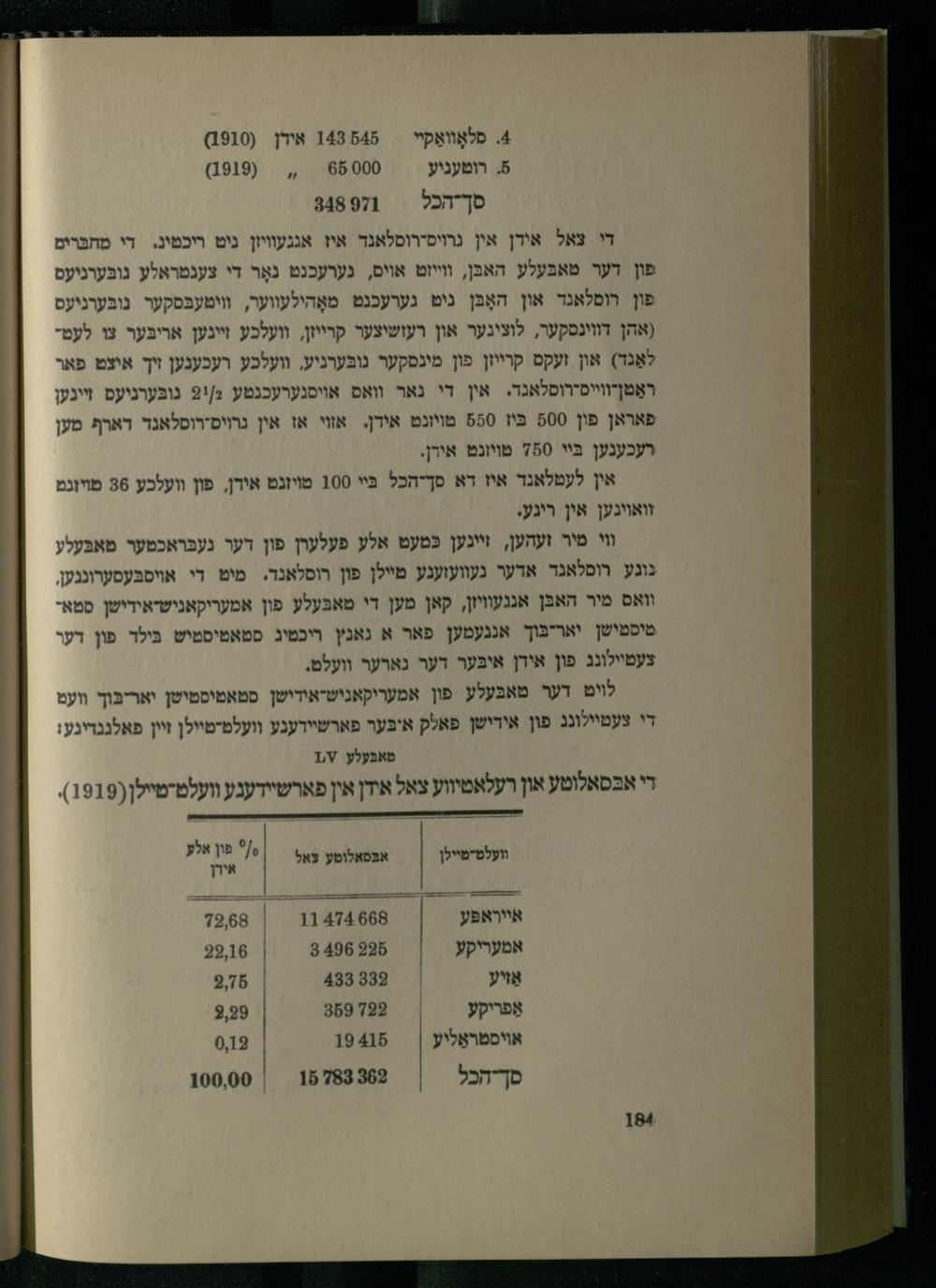 4 פלאָװאַקײ // 1438845 אידן(1910) 5. רוטעניע 0=2,(1919) סךיהכל// 448971 די צאל אידן אין גרויסירוסלאנד איז אגגעוויזן ניט ריכטיג. די מחבּרים פון דער טאבּעלע האבּן, ווייזט אויס, גערעכנט נאָר די צענטראלע גובּערניעס פון רופלאנד און האָבּן ניט גערעכנט מאָהילעווער, װימעבּסקער נובּערניעס (אהן דווינסקער, לוצינער און רעזשיצער קרייזן, וועלכע זייגען אריבּער צו לעטלאַנד) און זעקס קרייזן פון מינסקער נובּערניע, וועלכע רעכענען זיך איצט פאר ראַפןוויס-רוסלאנד. אין די נאר וואס אויסנערעכנטע 9:/2 גובּערניעס זיינען פאראן פון 800 בִּיז 820 מויזנט אידן. אזוי אז אין גרויסירוסלאנד דארף מען רעכענען בּיי 70 מויזנט אירן. אין לעמלאנד איז דא סך"הכל בּיי 100 טױזנט אירן, פון וועלכע 36 מויזנט זואויגען אין רינע. וי מיר זעהען, זיינען כּטעט אלע פעלערן פון דער נעבּראכטער טאבּעלע נוגע רומלאנד אדער געוועזענע מיילן פון רוסלאנד. מיט די אױסבּעסערונגען, וואס מיר האבּן אנגעוויזן, קאן מען די טאבּעלע פון אמעריקאניש-אידישן סטאטיסטישן יאריבּוך אנגעמען פאר א נאנץ ריכטיג סטאטיסטיש בּילד פון דער צעטיילונג פון אידן איבּער דער גארער וועלט, לוים דער טאבּעלע פון אמעריקאניש-אידישן סטאטיסטישן יאריבּוך װעט די צעטיילונג פון אידישן פאלק איבּער פארשיידענע וועלט-טיילן זיין פאלננדיגע! טאבעלע זי,1 די אבּסאלוטע און רעלאטיווע צאל אידן אין פארשיידענע וועלט-טיילן(1919).
