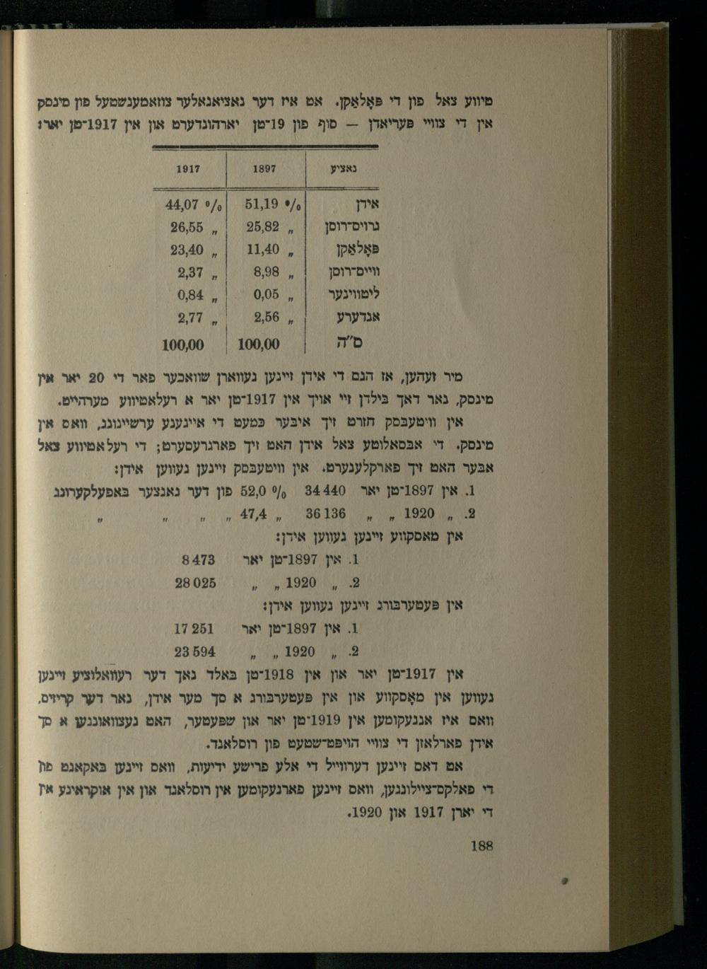 מיר זעהען, אז הנם די אידן זיינען נעווארן שוואכער פאר די 20 יאר אין מינסק, נאר דאך בּילדן זי אויך אין 1917-טן יאר א רעלאטיווע מערהייט. אין וימעבּמק חורט זיך איבּער כּמעט די איינענע ערשיינונג, ואס אין מינסק. די אבּסאלוטע צאל אידן האט זיך פארגרעסערט; די רעל אטיווע צאל אבּער האט זיך פארקלענערט.. אין וימעבּסק זיינען געווען אידן: 1. אין 1897יטן יאר 34440 ,'/' 82,0 פון דער נאנצער בּאפעלקערונג 5, 1090., /36136= 474 טי אין טאסקווע זיינען געווען אידן: 1. אין 1897יטן יאר 8473 2, 1920, 288 אין פּעמערבּורג זייגען געווען אירן: 1. אין 1897ימן יאר 1791 כּ', 1990,, 4 23 אין 1917יטן יאר און אין 1918יטן בּאלד גאך דער רעוואלוציע זיינען געווען אין מאָסקווע און אין פּעטערבּורג א סך מער אידן, נאר דער קריויס, וואס איז אנגעקומען אין 1919יטן יאר און שפּעטער, האט געצוואוננען א סך אידן פארלאזן די צוויי הױפּטישטעט פון רוסלאנד. אט דאס זיינען דערווייל די אלע פרישע ידיעות, וואס זיינען בּאקאנט פון די פאלקס-ציילונגען, וואס זיינען פארנעקומען אין רוסלאנד און אין אוקראינע אין די יארן 1917 און 1920.