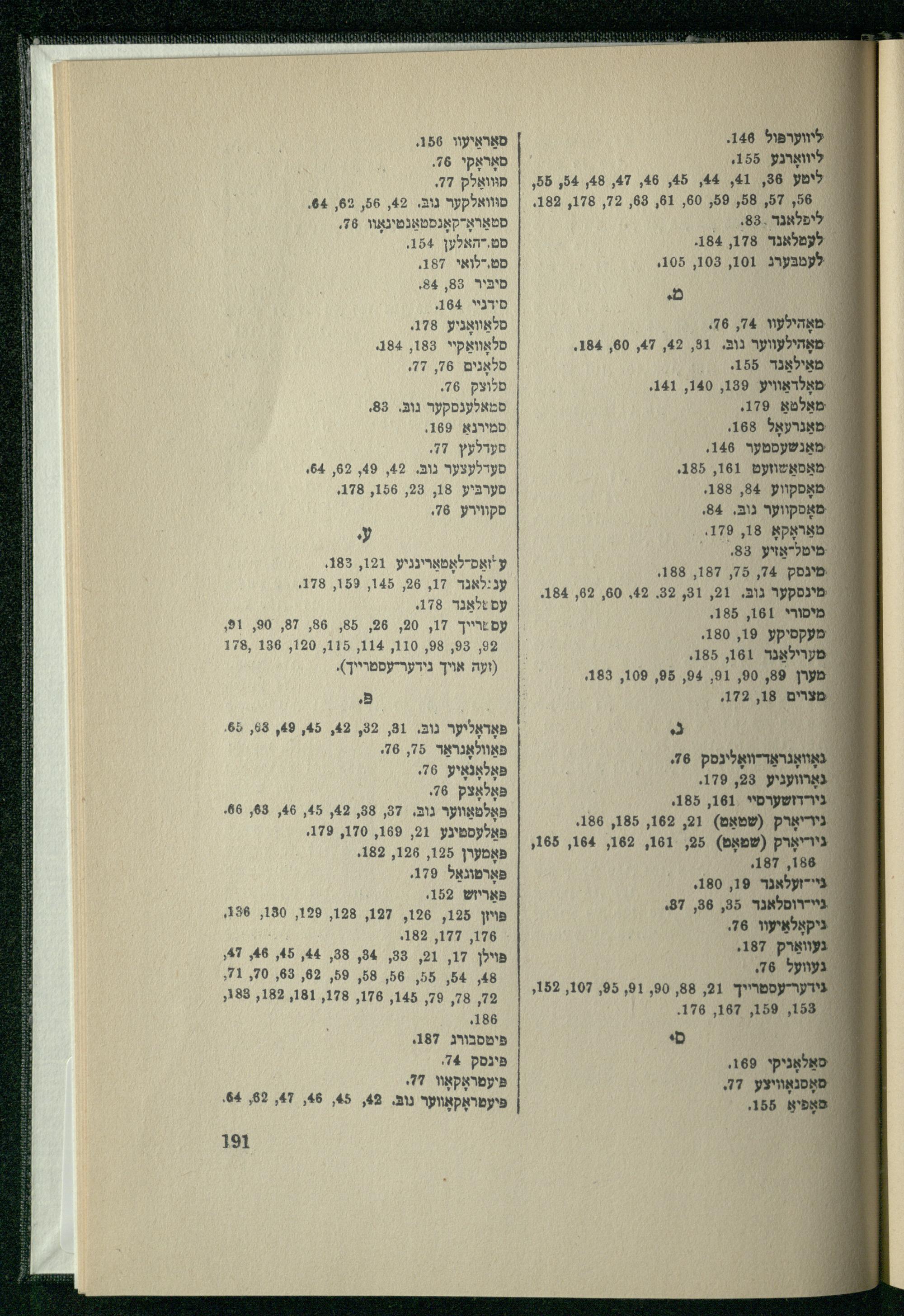 מאָהילעוו 74, 16. מאָהילעווער נופ. 81, 42, 47, 60, 184, מאַילאַנד 155. מאָלדאַװיע 189, 140, 141, מאַלטאַ 179, מאַגרעאָל 168, מאַנשעסטער 146, מאַסאַשװעט 161, 185, מאָסקװע 84, 188, מאָסקווער נובּ, 84, מאַראָקאָ 18, 179, מיטלדאַזיע 88,/|
