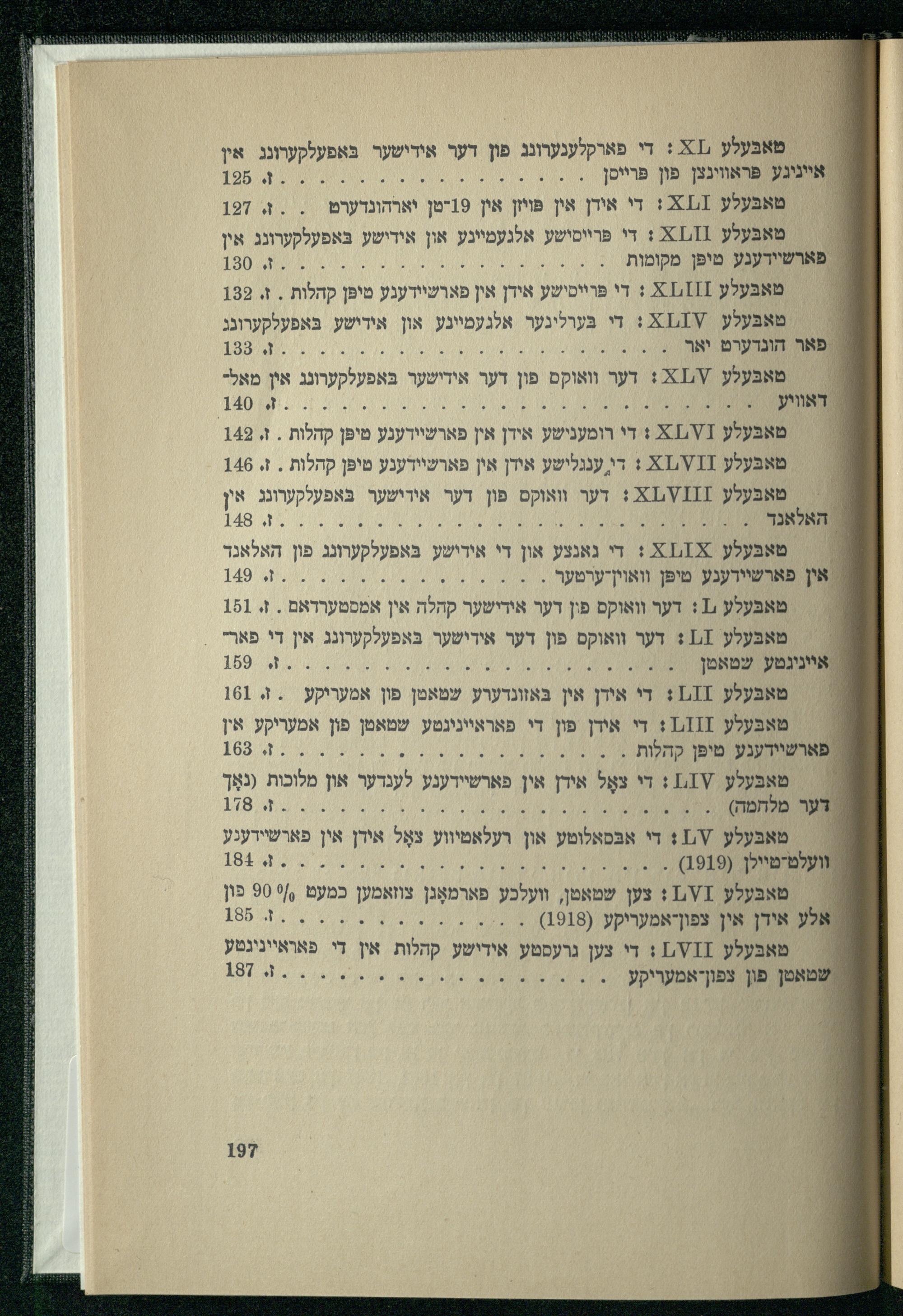 טאבעלע 412: די פארקלענערונג פון דער אידישער בּאפעלקערונג אין אייניגע פּראווינצן פון פּרײיסן טאבּעלע 2:1,1: די אידן אין פּױזן אין 19יטן יארהונדערט=.. ז, 197 : טאבּעלע 2:1,11: די פּרייסישע אלגעמיינע און אידישע בּאפעלקערונג אין פארשיידענע מיפּן מקומות { מאבּעלע 41,111: די פּרייסישע אידן אין פארשיידענע מיפּן קהלות. ז. 139 , טאבּעלע ,1 א: די מערלינער אלגעמיינע און אידישע באפעלקערוגג פאר הונדערט יאר , טאבעלע /,241: דער וואוקס פון דער אידישער בּאפעלקערונג אין מאל, דאוויע יי : טאבּעלע 1.1 4! די רומענישע אידן אין פארשיידענע טיפּן קהלות. ז, 149 טאבּעלע 11ט,1 א! די ענגלישע אידן אין פארשיידענע טיפּן קהלות. ז. 146 : טאבּעלע 241,0111: דער וואוקם פון דער אירישער בּאפעלקערונג אין האלאנדר += טאבעלע אז זא: די נאנצע און די אידישע בּאפעלקערונג פון האלאנד אין פארשיידענע מיפּן וואוין-ערטער ו מאבעלע.1: דער וואוקס פון דער אידישער קהלה אין אמסטערדאם. ז. 181 טאבּעלע 1,1: דער וואוקס פון דער אידישער בּאפעלקערונג אין די פאר". ייניגטע שטאטן 189 טאבּעלע 1,11: די אידן אין בּאזונדערע שטאטן פון. ז. 161 מאבּעלע 1,111: די אידן פון די פאראיינינטע שמאטן פון אמעריקע אין ײ: פארשיידעגע מיפּן קהלות = מאבעלע /'1,1: די צאָל אידן אין פארשיירענע לענדער און מלוכות(נאָך ער מלחמה) טאבּעלע /,1: די אבּסאלוטע און רעלאמיווע צאָל אידן אין פארשיידענע עלט-טיילן(1919) טאבּעלע 1ח,1: צען שטאטן, וועלכע פארמאָגן צוזאמען כמעט()/' 90 פון אלע אידן אין צפון-אמעריקע(1918) טאבּעלע 1,011: די צען גרעסטע אידישע א אין די פאראייניגטע אטן פון צפון-אמעריקע 5 187