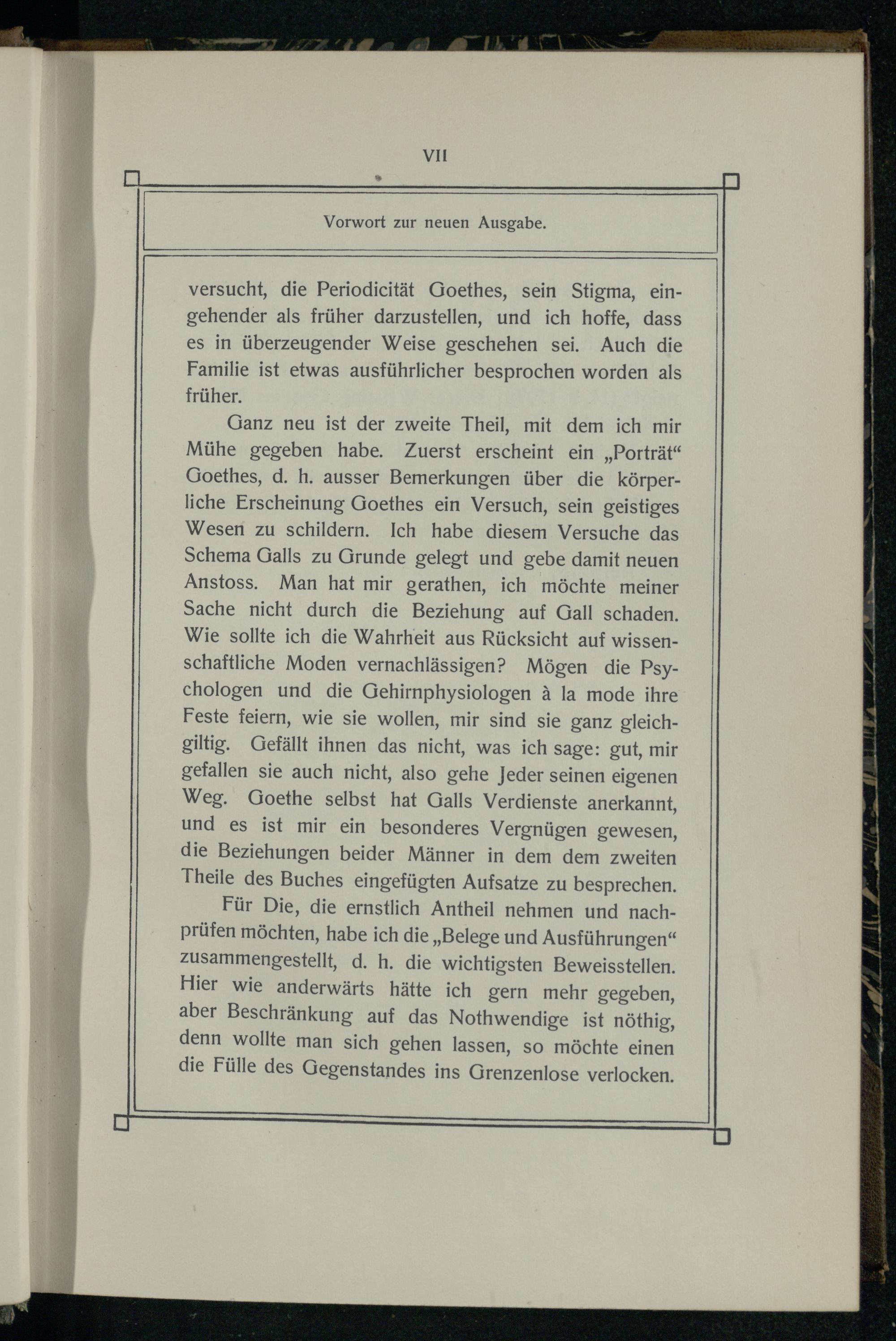 versucht, die Periodicität Goethes, sein Stigma, eingehender als früher darzustellen, und ich hoffe, dass es in überzeugender Weise geschehen sei. Auch die Familie ist etwas ausführlicher besprochen worden als früher.