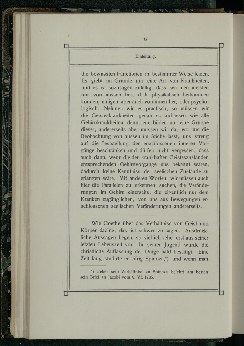 Wie Goethe über das Verhältniss von Geist und Körper dachte, das ist schwer zu sagen. Ausdrückliche Aussagen liegen, so viel ich sehe, erst aus seiner letzten Lebenszeit vor. In seiner Jugend wurde die christliche Auffassung der Dinge bald beseitigt. Eine Zeit lang studirte er eifrig Spinoza,*) und wenn man
