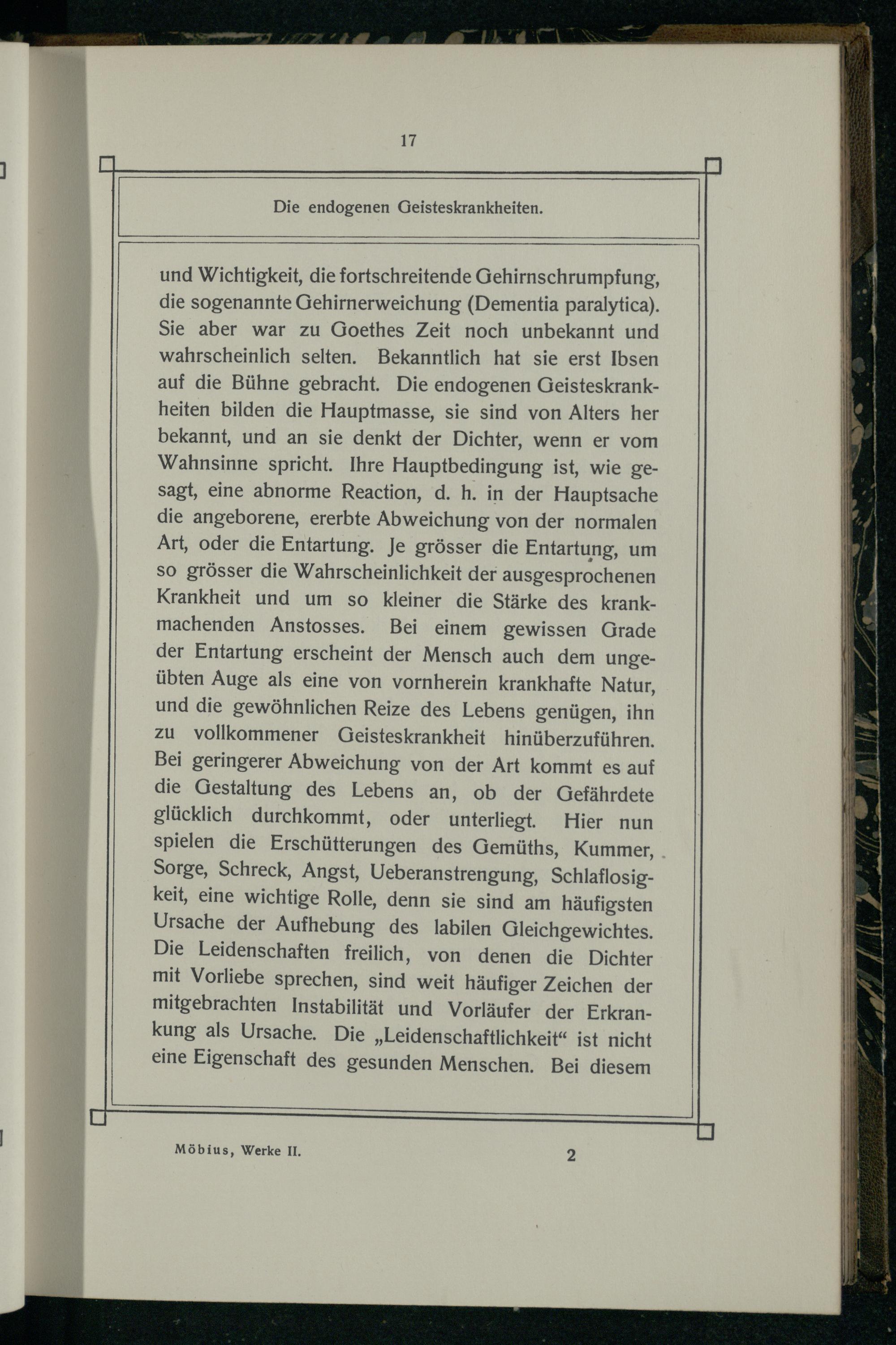 und Wichtigkeit, die fortschreitende Gehirnschrumpfung, die sogenannte Gehirnerweichung(Dementia paralytica). Sie aber war zu Goethes Zeit noch unbekannt und wahrscheinlich selten. Bekanntlich hat sie erst Ibsen auf die Bühne gebracht. Die endogenen Geisteskrankheiten bilden die Hauptmasse, sie sind von Alters her bekannt, und an sie denkt der Dichter, wenn er vom Wahnsinne spricht. Ihre Hauptbedingung ist, wie gesagt, eine abnorme Reaction, d. h. in der Hauptsache die angeborene, ererbte Abweichung von der normalen Art, oder die Entartung. Je grösser die Entartung, um so grösser die Wahrscheinlichkeit der ausgesprochenen Krankheit und um so kleiner die Stärke des krankmachenden Anstosses. Bei einem gewissen Grade der Entartung erscheint der Mensch auch dem ungeübten Auge als eine von vornherein krankhafte Natur, und die gewöhnlichen Reize des Lebens genügen, ihn zu Vvollkommener Geisteskrankheit hinüberzuführen. Bei geringerer Abweichung von der Art kommt es auf die Gestaltung des Lebens an, ob der Gefährdete glücklich durchkommt, oder unterliegt. Hier nun spielen die Erschütterungen des Gemüths, Kummer, Sorge, Schreck, Angst, Ueberanstrengung, Schlaflosigkeit, eine wichtige Rolle, denn sie sind am häufigsten Ursache der Aufhebung des labilen Gleichgewichtes. Die Leidenschaften freilich, von denen die Dichter mit Vorliebe sprechen, sind weit häufiger Zeichen der mitgebrachten Instabilität und Vorläufer der Erkrankung als Ursache. Die„Leidenschaftlichkeit“ ist nicht eine Eigenschaft des gesunden Menschen. Bei diesem