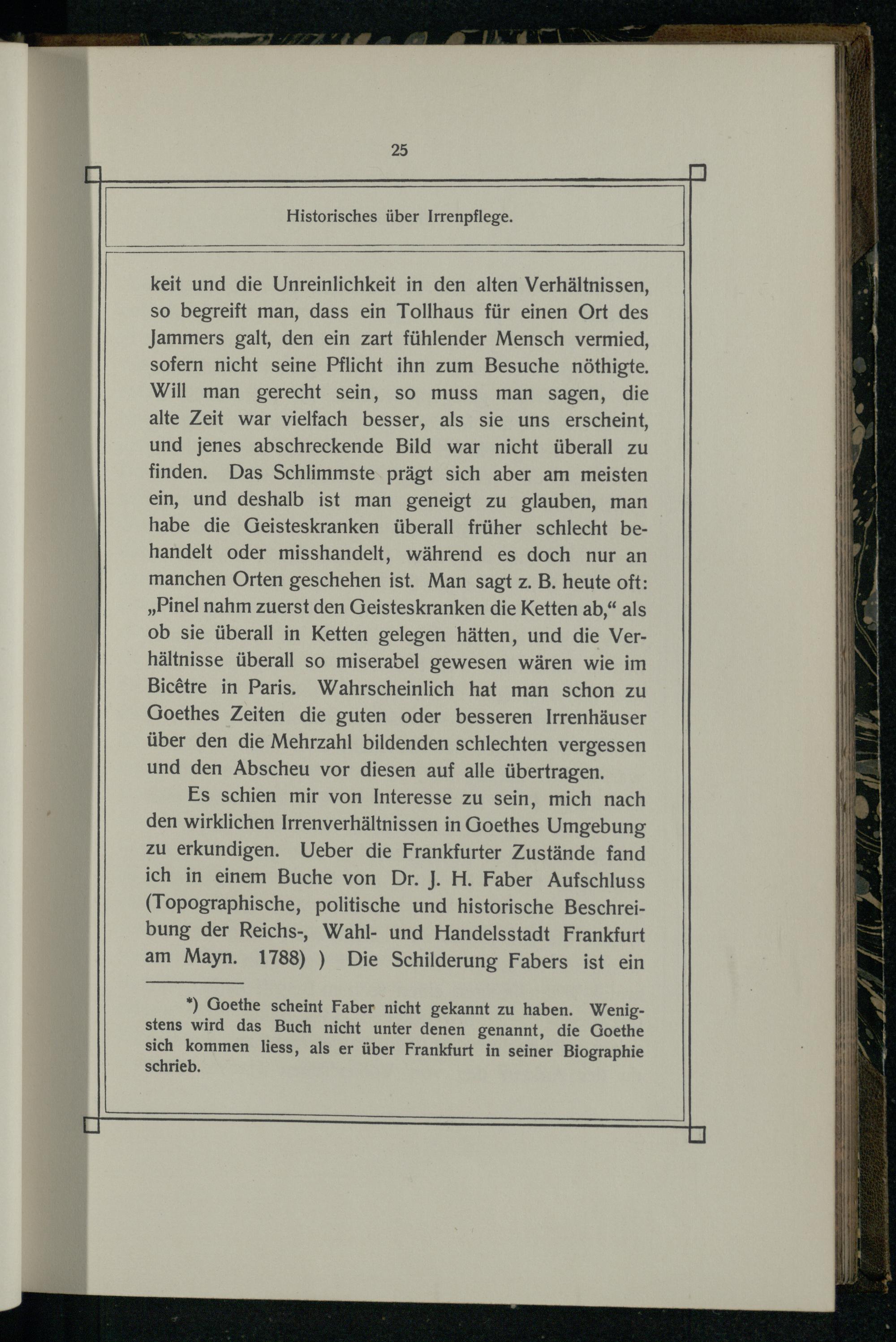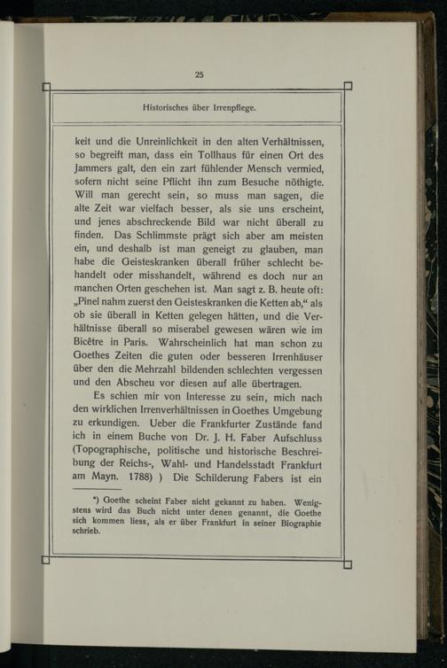 Es schien mir von Interesse zu sein, mich nach den wirklichen Irrenverhältnissen in Goethes Umgebung zu erkundigen. Ueber die Frankfurter Zustände fand ich in einem Buche von Dr. J. H. Faber Aufschluss (Topographische, politische und historische Beschreibung der Reichs-, Wahl- und Handelsstadt Frankfurt am Mayn. 1788)) Die Schilderung Fabers ist ein