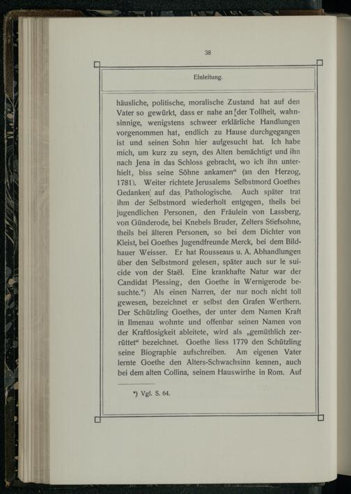 häusliche, politische, moralische Zustand hat auf den Vater so gewürkt, dass er nahe an[der Tollheit, wahnsinnige, wenigstens schweer erklärliche Handlungen vorgenommen hat, endlich zu Hause durchgegangen ist und seinen Sohn hier aufgesucht hat. Ich habe mich, um kurz zu seyn, des Alten bemächtigt und ihn nach Jena in das Schloss gebracht, wo ich ihn unterhielt, biss seine Söhne ankamen“(an den Herzog, 1781). Weiter richtete Jerusalems Selbstmord Goethes Gedanken! auf das Pathologische. Auch später trat ihm der Selbstmord wiederholt entgegen, theils bei jugendlichen Personen, den Fräulein von Lassberg, von Günderode, bei Knebels Bruder, Zelters Stiefsohne, theils bei älteren Personen, so bei dem Dichter von Kleist, bei Goethes Jugendfreunde Merck, bei dem Bildhauer Weisser. Er hat Rousseaus u. A. Abhandlungen über den Selbstmord gelesen, später auch sur le suicide von der Stae@l. Eine krankhafte Natur war der Candidat Plessing, den Goethe in Wernigerode besuchte.*) Als einen Narren, der nur noch nicht toll gewesen, bezeichnet er selbst den Grafen Werthern. Der Schützling Goethes, der unter dem Namen Kraft in Ilmenau wohnte und offenbar seinen Namen von der Kraftlosigkeit ableitete, wird als„gemüthlich zerrüttet“ bezeichnet. Goethe liess 1779 den Schützling seine Biographie aufschreiben. Am eigenen Vater lernte Goethe den Alters-Schwachsinn kennen, auch bei dem alten Collina, seinem Hauswirthe in Rom. Auf