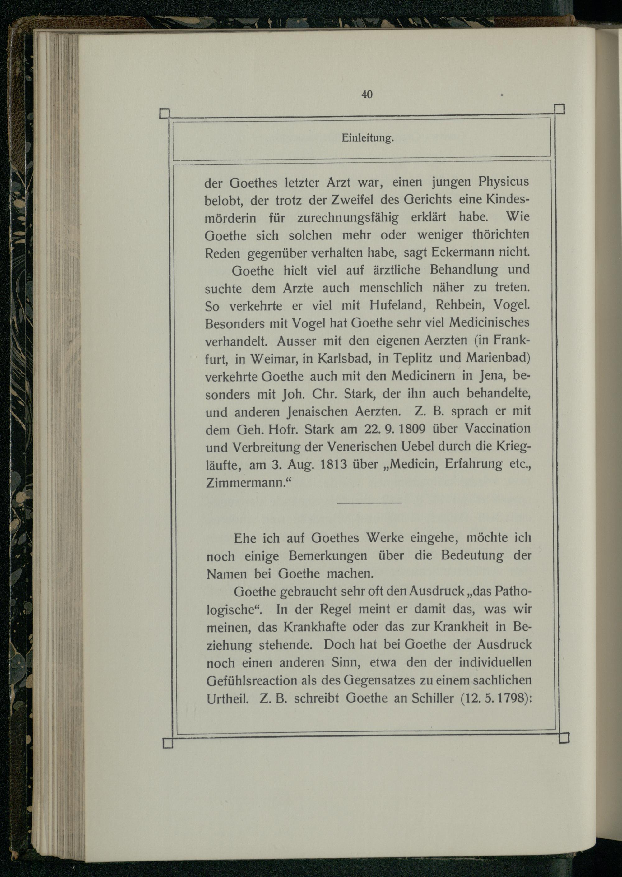 Goethe gebraucht sehr oft den Ausdruck„das Pathologische“. In der Regel meint er damit das, was wir meinen, das Krankhafte oder das zur Krankheit in Beziehung stehende. Doch hat bei Goethe der Ausdruck noch einen anderen Sinn, etwa den der individuellen Gefühlsreaction als des Gegensatzes zu einem sachlichen Urtheil. Z.B. schreibt Goethe an Schiller(12. 5. 1798):