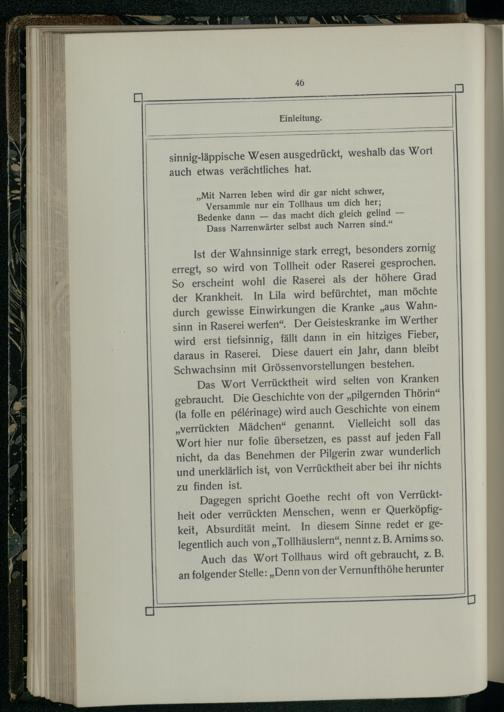 Ist der Wahnsinnige stark erregt, besonders zornig erregt, so wird von Tollheit oder Raserei gesprochen. So erscheint wohl die Raserei als der höhere Grad der Krankheit. In Lila wird befürchtet, man möchte durch gewisse Einwirkungen die Kranke„aus Wahnsinn in Raserei werfen“. Der Geisteskranke im Werther wird erst tiefsinnig, fällt dann'in ein hitziges Fieber, daraus in Raserei. Diese dauert ein Jahr, dann bleibt Schwachsinn mit Grössenvorstellungen bestehen.