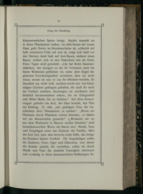 Kammermädchen Speise bringt. Nachts wandelt sie in ihren Phantasieen umher; sie zieht herum mit losem Haar, geht Kreise im Mondenscheine ab, schleicht mit halb unsicherm Tritte auf und ab, neigt sich bald vor den Sternen, kniet bald auf dem Rasen, umfasst einen Baum, verliert sich in den Sträuchern wie ein Geist. Eines Tages wird gemeldet:„Lila hat ihrem Kammermädchen, der einzigen zu der ihr Vertrauen auch bei ihrem Wahnsinn geblieben ist, unter dem Siegel der grössten Verschwiegenheit versichert, dass sie wohl wisse, woran sie sey: es sey ihr offenbart worden, ihr Sternthal sey nicht todt, sondern werde nur von feindseligen Geistern gefangen gehalten, die auch ihr nach der Freiheit strebten; desswegen sie unerkannt und heimlich herumwandern müsse, bis sie Gelegenheit und Mittel fände, ihn zu befreien.“ Auf diese Aeusserungen gründet ein Arzt, der dazu kommt, den Plan der Heilung. Er räth,„der gnädigen Frau die Geschichten ihrer Phantasieen zu spielen.“„Wenn wir Phantasie durch Phantasie curiren könnten, so hätten wir ein Meisterstück gemacht.“(„Wodurch wir sie aus dem Wahnsinn in Raserei werfen könnten,“ wirft bemerkenswerther Weise der Baron ein.) Musik, Tanz und Vergnügen seien das Element der Familie, fährt der Arzt fort, jetzt aber herrsche todte Stille, das bringe der Kranken keinen Vortheil. Die Angehörigen sollen die Zauberer, Feen, Oger und Dämonen, von denen die Kranke spricht, ihr vorstellen, sollen sie durch Musik und Tanz der dunkeln Traurigkeit entreissen und vorläufig in ihren abenteuerlichen Hoffnungen be