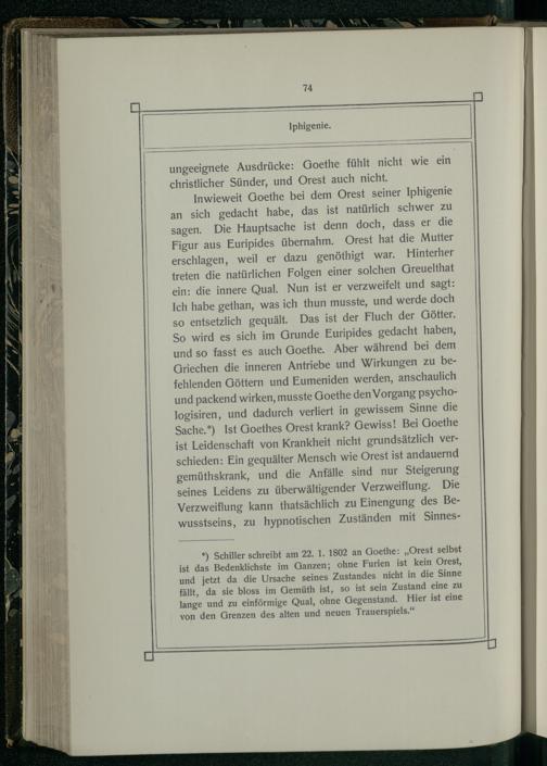 Inwieweit Goethe bei dem Orest seiner Iphigenie an sich gedacht habe, das ist natürlich schwer zu sagen. Die Hauptsache ist denn doch, dass er die Figur aus Euripides übernahm. Orest hat die Mutter erschlagen, weil er dazu genöthigt war. Hinterher treten die natürlichen Folgen einer solchen Greuelthat ein: die innere Qual. Nun ist er verzweifelt und sagt: Ich habe gethan, was ich thun musste, und werde doch so entsetzlich gequält. Das ist der Fluch der Götter. So wird es sich im Grunde Euripides gedacht haben, und so fasst es auch Goethe. Aber während bei dem Griechen die inneren Antriebe und Wirkungen zu befehlenden Göttern und Eumeniden werden, anschaulich und packend wirken, musste Goethe den Vorgang psychologisiren, und dadurch verliert in gewissem Sinne die Sache.*) Ist Goethes Orest krank? Gewiss! Bei Goethe ist Leidenschaft von Krankheit nicht grundsätzlich verschieden: Ein gequälter Mensch wie Orest ist andauernd gemüthskrank, und die Anfälle sind nur Steigerung seines Leidens zu überwältigender Verzweiflung. Die Verzweiflung kann thatsächlich zu Einengung des Bewusstseins, zu hypnotischen Zuständen mit Sinnes