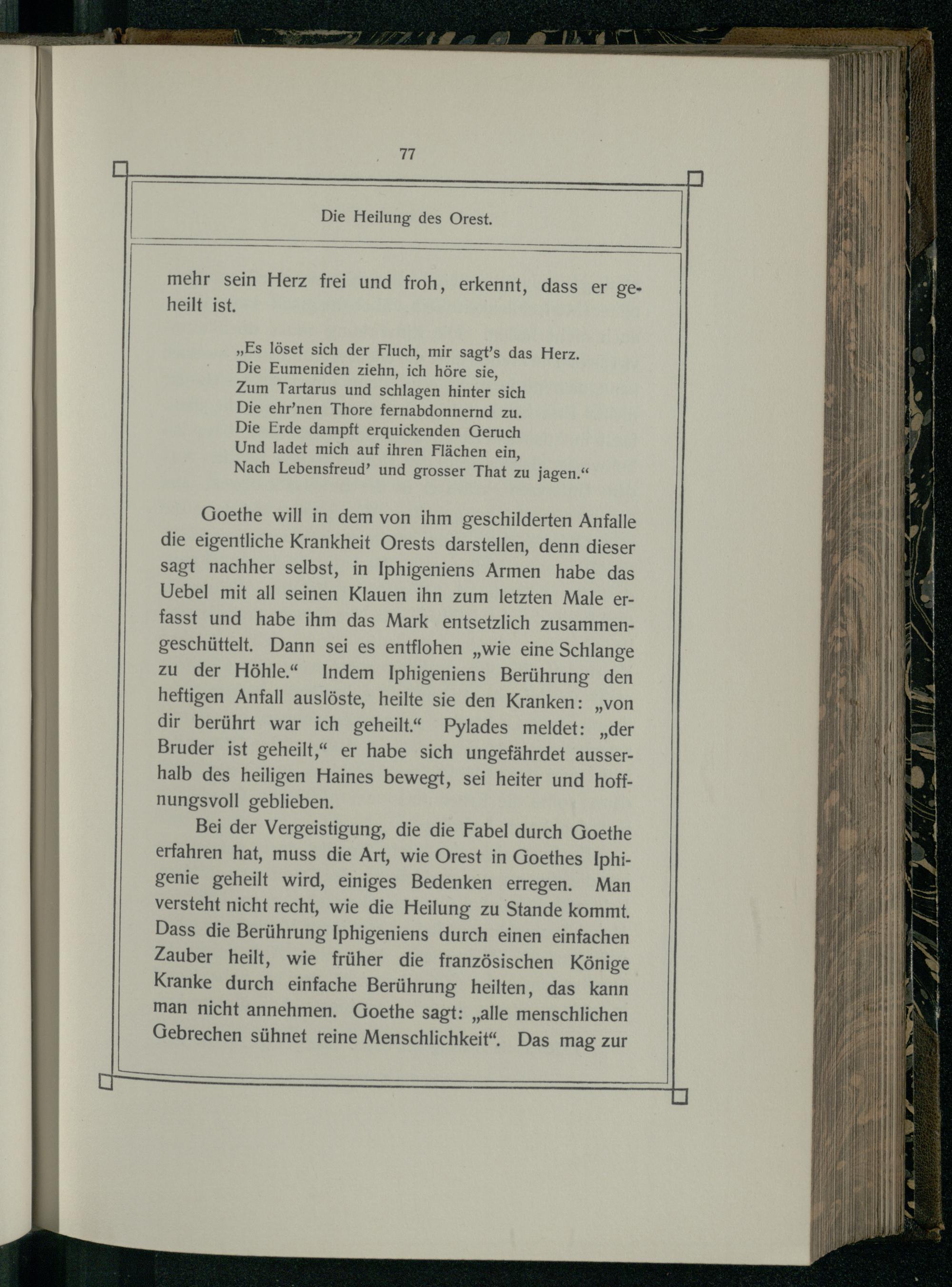 Bei der Vergeistigung, die die Fabel durch Goethe erfahren hat, muss die Art, wie Orest in Goethes Iphigenie geheilt wird, einiges Bedenken erregen. Man versteht nicht recht, wie die Heilung zu Stande kommt. Dass die Berührung Iphigeniens durch einen einfachen Zauber heilt, wie früher die französischen Könige Kranke durch einfache Berührung heilten, das kann man nicht annehmen. Goethe sagt:„alle menschlichen Gebrechen sühnet reine Menschlichkeit“. Das mag zur