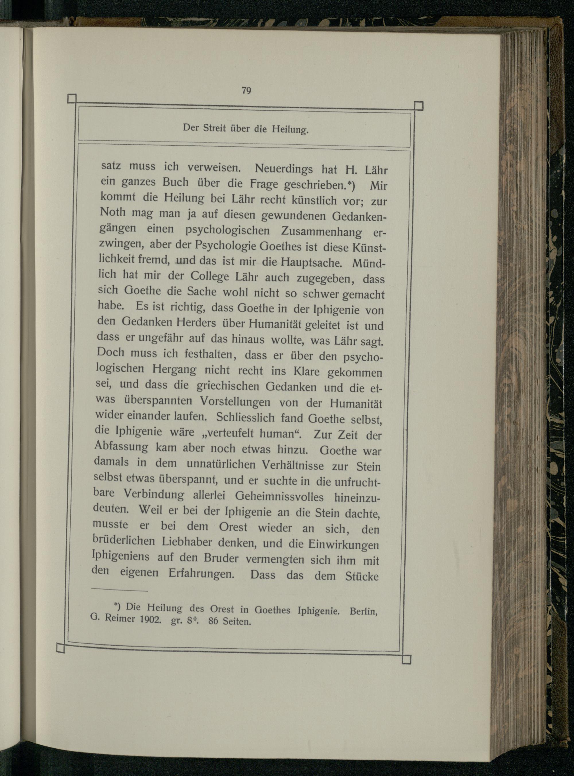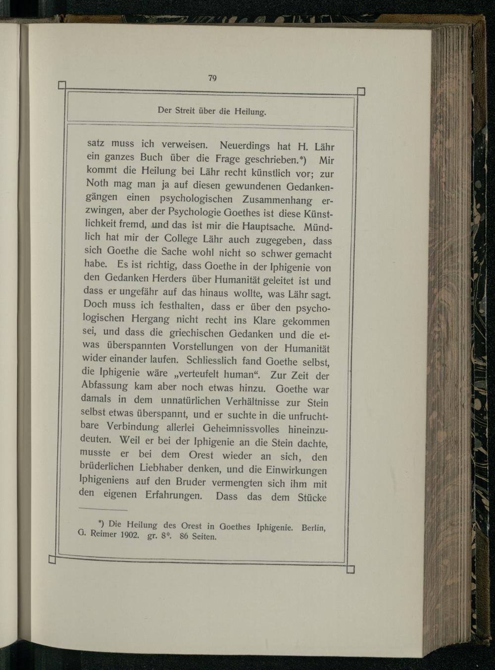 satz muss ich verweisen. Neuerdings hat H. Lähr ein ganzes Buch über die Frage geschrieben.*) Mir kommt die Heilung bei Lähr recht künstlich Vor; zur Noth mag man ja auf diesen gewundenen Gedankengängen einen psychologischen Zusammenhang erzwingen, aber der Psychologie Goethes ist diese Künstlichkeit fremd, und das ist mir die Hauptsache. Mündlich hat mir der College Lähr auch zugegeben, dass sich Goethe die Sache wohl nicht so schwer gemacht habe. Es ist richtig, dass Goethe in der Iphigenie von den Gedanken Herders über Humanität geleitet ist und dass er ungefähr auf das hinaus wollte, was Lähr sagt. Doch muss ich festhalten, dass er über den psychologischen Hergang nicht recht ins Klare gekommen sei, und dass die griechischen Gedanken und die etwas überspannten Vorstellungen von der Humanität wider einander laufen. Schliesslich fand Goethe selbst, die Iphigenie wäre„verteufelt human“. Zur Zeit der Abfassung kam aber noch etwas hinzu. Goethe war damals in dem unnatürlichen Verhältnisse zur Stein selbst etwas überspannt, und er suchte in die unfruchtbare Verbindung allerlei Geheimnissvolles hineinzudeuten. Weil er bei der Iphigenie an die Stein dachte, musste er bei dem Orest wieder an sich, den brüderlichen Liebhaber denken, und die Einwirkungen Iphigeniens auf den Bruder vermengten sich ihm mit den eigenen Erfahrungen. Dass das dem Stücke