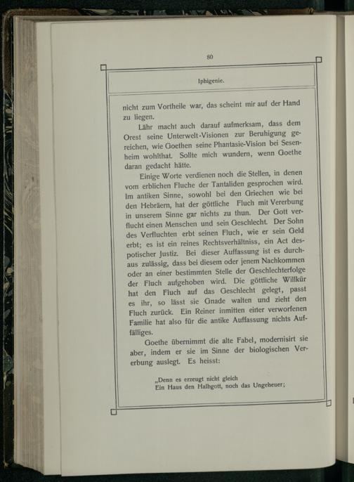 Einige Worte verdienen noch die Stellen, in denen vom erblichen Fluche der Tantaliden gesprochen wird. Im antiken Sinne, sowohl bei den Griechen wie bei den Hebräern, hat der göttliche Fluch mit Vererbung in unserem Sinne gar nichts zu thun. Der Gott verflucht einen Menschen und sein Geschlecht. Der Sohn des Verfluchten erbt seinen Fluch, wie er sein Geld erbt; es ist ein reines Rechtsverhältniss, ein Act despotischer Justiz. Bei dieser Auffassung ist es durchaus zulässig, dass bei diesem oder jenem Nachkommen oder an einer bestimmten Stelle der Geschlechterfolge der Fluch aufgehoben wird. Die göttliche Willkür hat den Fluch auf das Geschlecht gelegt, passt es ihr, so lässt sie Gnade walten und zieht den Fluch zurück. Ein Reiner inmitten einer verworfenen Familie hat also für die antike Auffassung nichts Auffälliges.