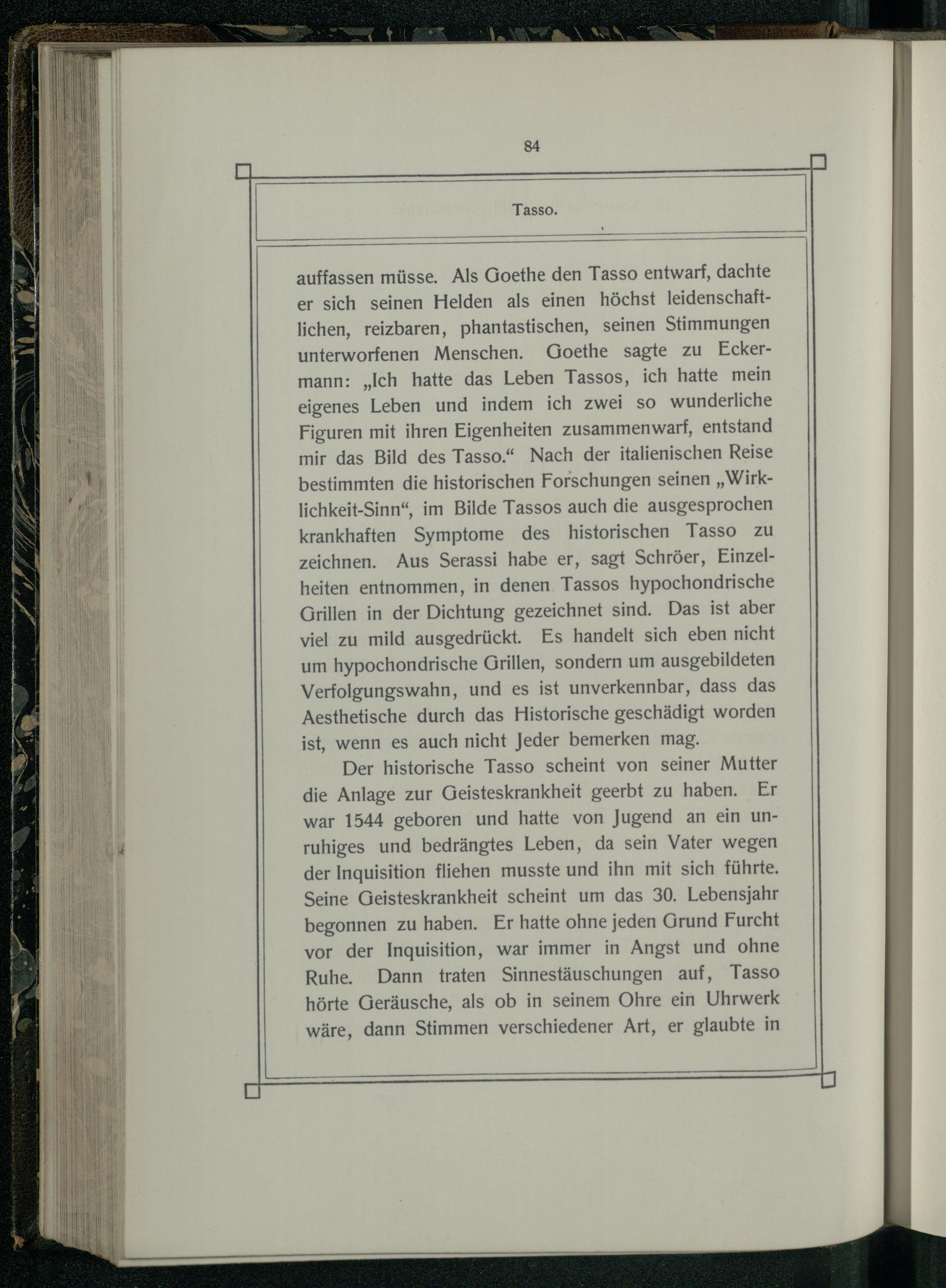 auffassen müsse. Als Goethe den Tasso entwarf, dachte er sich seinen Helden als einen höchst leidenschaftlichen, reizbaren, phantastischen, seinen Stimmungen unterworfenen Menschen. Goethe sagte zu Eckermann:„Ich hatte das Leben Tassos, ich hatte mein eigenes Leben und indem ich zwei so wunderliche Figuren mit ihren Eigenheiten zusammenwarf, entstand mir das Bild des Tasso.“ Nach der italienischen Reise bestimmten die historischen Forschungen seinen„Wirklichkeit-Sinn“, im Bilde Tassos auch die ausgesprochen krankhaften Symptome des historischen Tasso zu zeichnen. Aus Serassi habe er, sagt Schröer, Einzelheiten entnommen, in denen, Tassos hypochondrische Grillen in der Dichtung gezeichnet sind. Das ist aber viel zu mild ausgedrückt. Es handelt sich eben nicht um hypochondrische Grillen, sondern um ausgebildeten Verfolgungswahn, und es ist unverkennbar, dass das Aesthetische durch das Historische geschädigt worden ist, wenn es auch nicht Jeder bemerken mag.