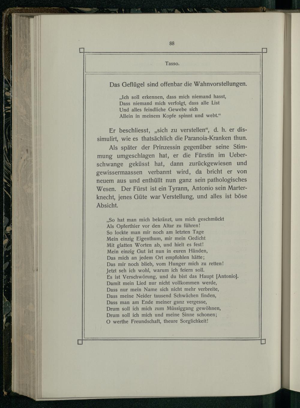 Als später der Prinzessin gegenüber seine Stimmung umgeschlagen hat, er die Fürstin im Ueberschwange geküsst hat, dann zurückgewiesen und gewissermaassen verbannt wird, da bricht er von neuem aus und enthüllt nun ganz sein pathologisches Wesen. Der Fürst ist ein Tyrann, Antonio sein Marterknecht, jenes Güte war Verstellung, und alles ist böse Absicht.
