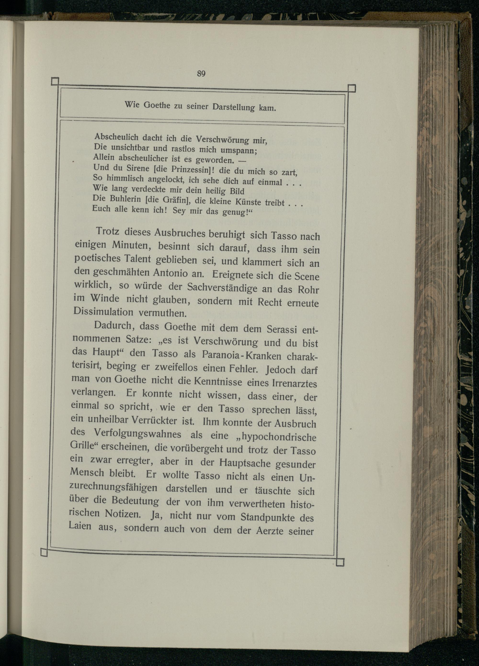 Dadurch, dass Goethe mit dem dem Serassi enthommenen Satze:„es ist Verschwörung und du bist das Haupt“ den Tasso als Paranoia- Kranken charakterisirt, beging er zweifellos einen Fehler. Jedoch darf man von Goethe nicht die Kenntnisse eines Irrenarztes verlangen. Er konnte nicht wissen, dass einer, der einmal so spricht,. wie er den Tasso sprechen lässt, ein unheilbar Verrückter ist. Ihm konnte der Ausbruch des Verfolgungswahnes als eine„hypochondrische Orille“ erscheinen, die vorübergeht und trotz der Tasso ein zwar erregter, aber in der Hauptsache gesunder Mensch bleibt. Er wollte Tasso nicht als einen UnZzurechnungsfähigen darstellen und er täuschte sich über die Bedeutung der von ihm verwertheten historischen Notizen. Ja, nicht nur vom Standpunkte des Laien aus, sondern auch von dem der Aerzte seiner
