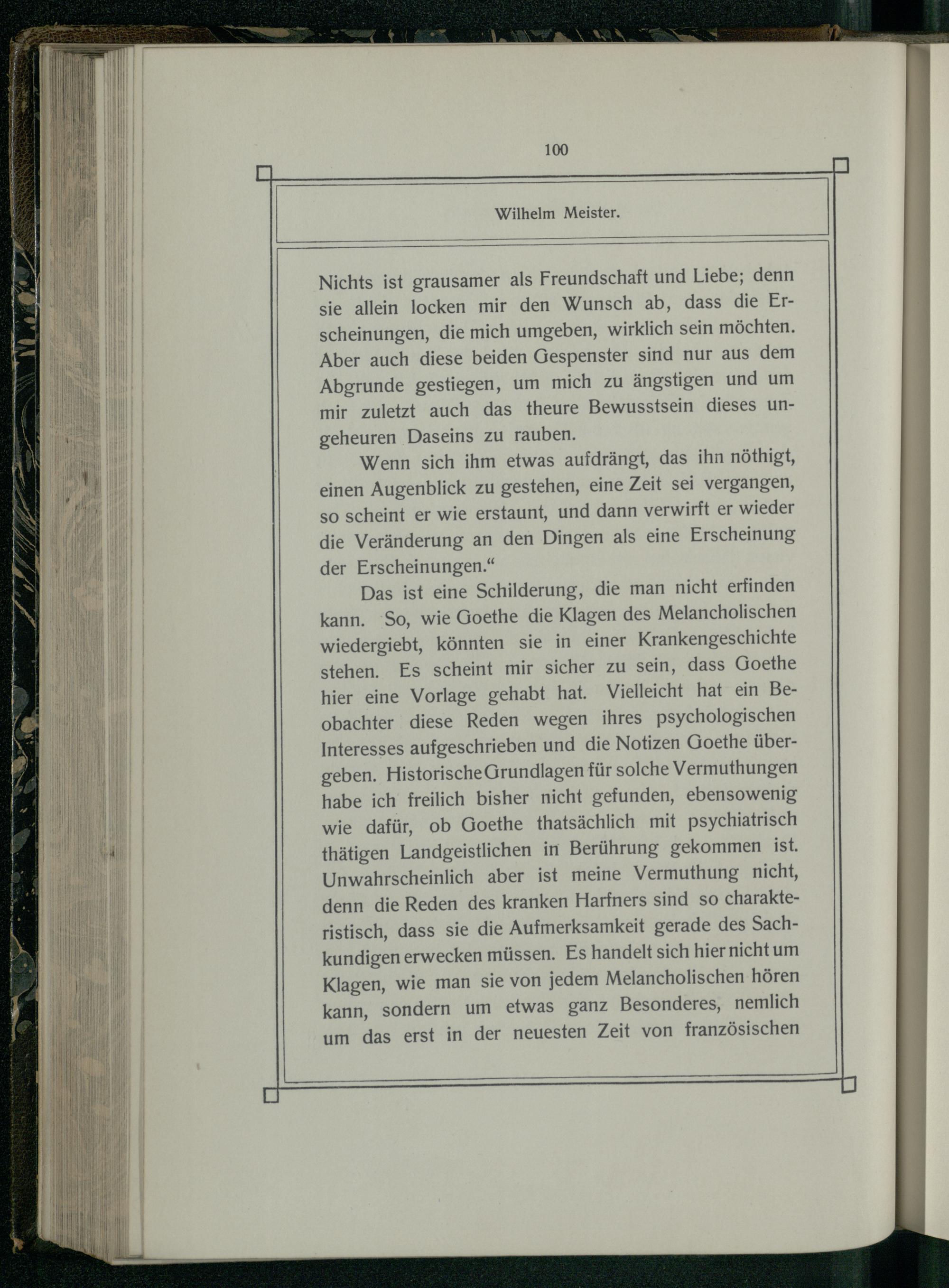 Das ist eine Schilderung, die man nicht erfinden kann. So, wie Goethe die Klagen des Melancholischen wiedergiebt, könnten sie in einer Krankengeschichte stehen. Es scheint mir sicher zu sein, dass Goethe hier eine Vorlage gehabt hat. Vielleicht hat ein Beobachter diese Reden wegen ihres psychologischen Interesses aufgeschrieben und die Notizen Goethe übergeben. Historische Grundlagen für solche Vermuthungen habe ich freilich bisher nicht gefunden, ebensowenig wie dafür, ob Goethe thatsächlich mit psychiatrisch thätigen Landgeistlichen in Berührung gekommen ist. Unwahrscheinlich aber ist meine Vermuthung nicht, denn die Reden des kranken Harfners sind so charakteristisch, dass sie die Aufmerksamkeit gerade des Sachkundigen erwecken müssen. Es handelt sich hier nicht um Klagen, wie man sie von jedem Melancholischen hören kann, sondern um etwas ganz Besonderes, nemlich um das erst in der neuesten Zeit von französischen