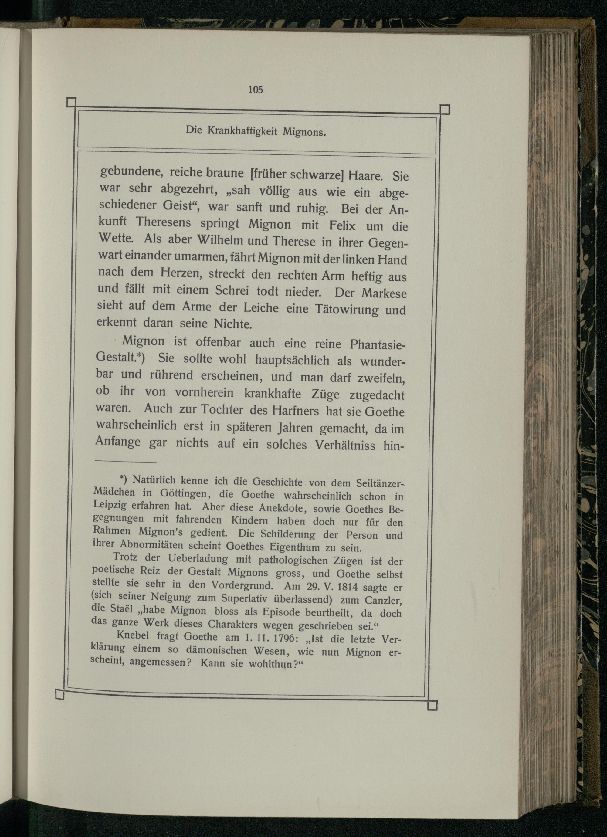 *) Natürlich kenne ich die Geschichte von dem SeiltänzerMädchen in Göttingen, die Goethe wahrscheinlich schon in Leipzig erfahren hat. Aber diese Anekdote, sowie Goethes Begegnungen mit fahrenden Kindern haben doch nur für den Rahmen Mignon’s gedient. Die Schilderung der Person und ihrer Abnormitäten scheint Goethes Eigenthum zu sein.